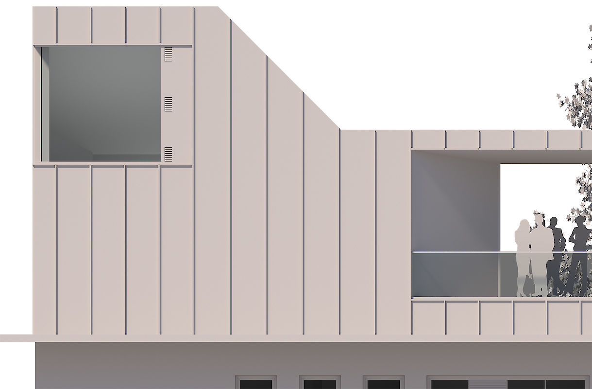 Die turmartige Erhöhung an der Gebäudeecke fungiert in beide Richtungen als Laterne, ohne die Forderung nach der Blickfreiheit aus dem 2. Bestands-OG wirklich zu schmälern. Übrigens werden auch künftige Seminare davon profitieren, wenn nicht mehr der ausgeführte Hund die Aufmerksamkeit der Teilnehmer beansprucht, sondern der Vortragende. Eine Beletage hat nicht nur funktionale Vorteile, sondern auch ganz klassische stadträumliche Wirkung.