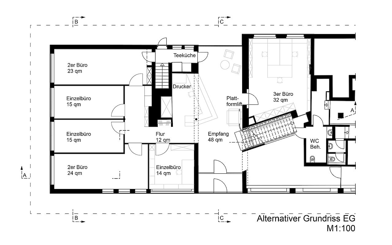 Wer schon mal ein Seminar bei der Architektenkammer besucht hat, weiß um die unglückliche Raumausrichtung und die daraus resultierenden Interaktionen und um das Raumklima, denn Vorträge werden (nicht nur im Hochsommer bei offenen Fenstern) zwangsläufig durch Passanten gestört. Bevor sich dieses Provisorium und somit dieses Dilemma weiter manifestiert, schlagen die Verfasser eine gründliche Revision der Aufgabestellung vor – schließlich wird die Landesgeschäftsstelle nur ca. alle 25 bis 30 Jahre umgebaut (zuletzt 1995).