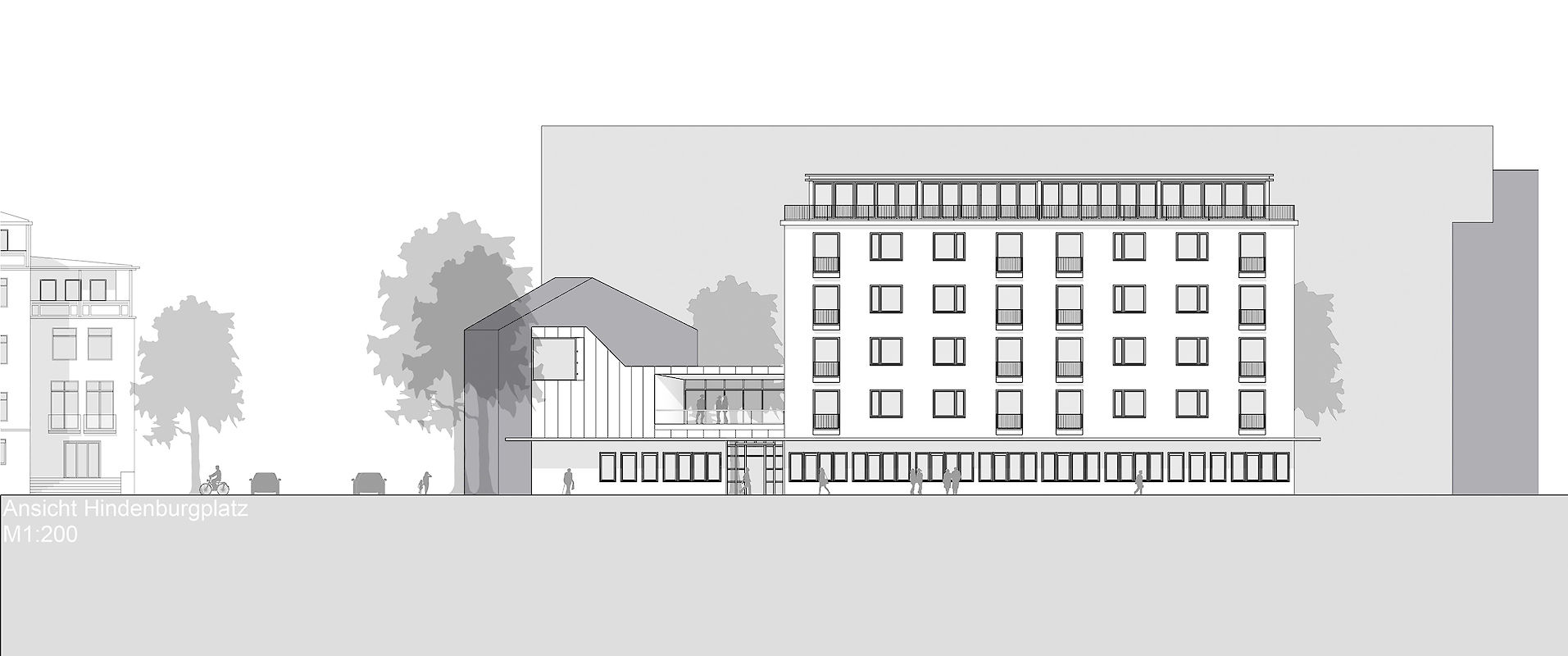 Die Architektenkammer Rheinland-Pfalz betreibt ihre Landesgeschäftsstelle am Hindenburgplatz 2-6 in Mainz, in einem sehr sachlichen Nachkriegsbau, bar jeder Eigenschaft oder Ambition mit dem Stadtraum in Austausch zu treten. Klassische Themen wie Blockrandschließung, Eckbetonungen und Erker, Hochparterre und Eingangsportale kennt das Gebäude nicht und im Bereich des erdgeschossigen Flachdachanbaus verweigert sich das Gebäude komplett der Interaktion mit dem Städtebau, welcher seit knapp 150 Jahren die Neustadt prägt.