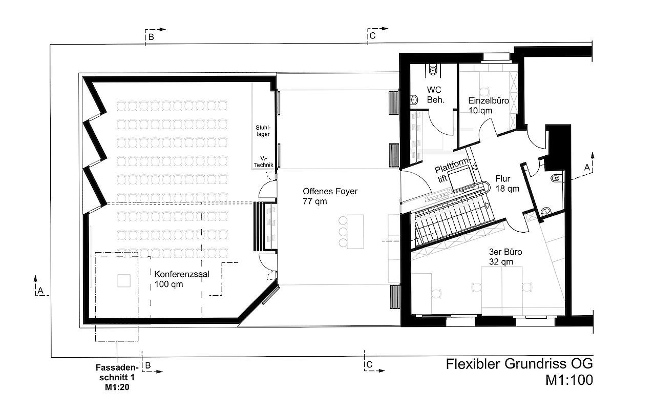 Die vorhandene Decke über dem Versammlungsraum, die insbesondere auch brandschutztechnisch keinen ausreichenden Feuerwiderstand aufweist, braucht nicht ertüchtigt zu werden. Im Brandfall dient sie als „konstruktives Hitzeschild“. Die Holzkonstruktion wird nach den Anforderungen des Brandschutzes und der Statik ausgelegt.
