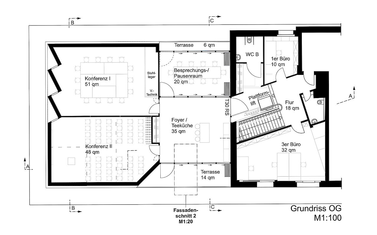 Durch die Nutzungsschichtung und Verlagerung der Konferenz- und Besprechungsräume nach oben in die Beletage gekoppelt mit dem großzügigen Foyer, können bis zu 3 Besprechungen oder kleinere Konferenzen mit bis zu 50 Teilnehmer gleichzeitig, oder auch eine große Konferenz mit knapp 100 Teilnehmern stattfinden. Besonders an heißen Sommertagen werden Konferenzen erträglicher, da das Foyer zu zwei Seiten komplett geöffnet und quergelüftet werden kann, während der Dachvorsprung über der Terrasse in den Sommermonaten die Einstrahlung der hochstehenden Sonne stark reduziert und im Winter ein tageslichterfülltes Foyer ermöglicht. Auch die nordwärts eingeschnittenen Fenster im Konferenzsaal sorgen für ein angenehmes, weil schattenfreies Tageslicht.Abgehängte Akustikdecken kompensieren (besonders im Foyer) die Schallreflektionen des hohen Glasanteils.