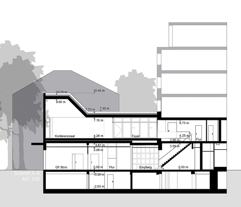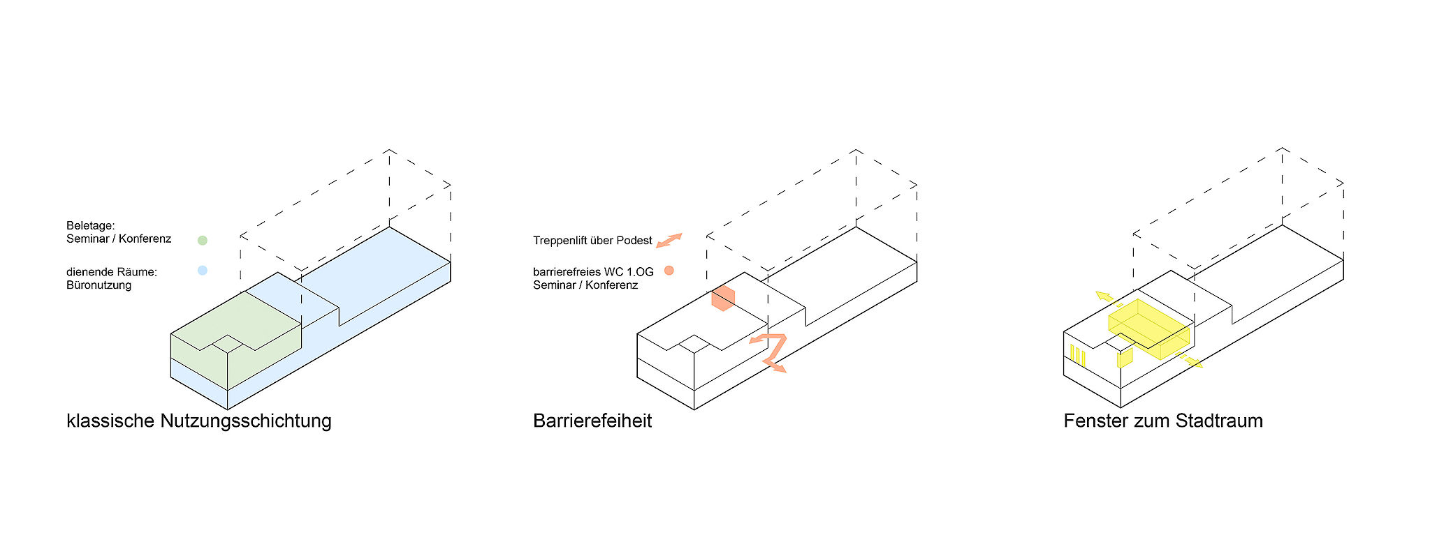 Unter genauer Beachtung der konstruktiven Vorgaben schlagen die Verfasser eine klassische Nutzungsschichtung vor – unten die Nebenräume (in diesem Falle die Büros, denn das Funktionieren darf vorausgesetzt werden) und oben die Beletage mit Vortrags-, Konferenzräumen und Foyer, denn nur hierdurch teilt sich die Architektenkammer dem Stadtraum sichtbar mit, wenn das Foyer belebt ist und in den Räumen getagt und diskutiert wird, denn das ist das Bild, welches die Kammer auch nach Außen kommunizieren sollte, damit der Berufsstand in der Öffentlichkeit wahrgenommen wird!