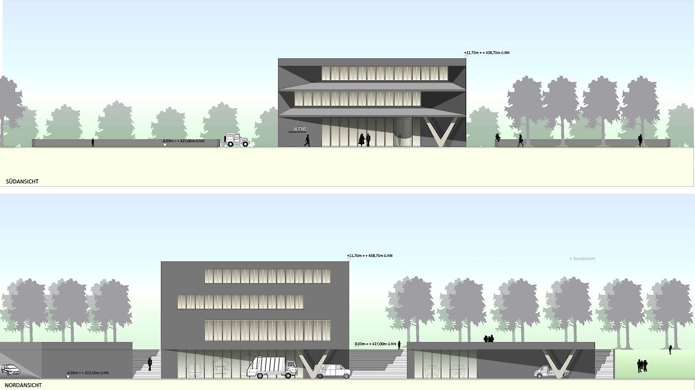 Ebenfalls dem Betriebshof zugeordnet liegen extern Lagerräume, als Sockelgeschoss einer künftigen Erweiterung. Der Betriebshof und die Besucherterrasse dienen somit auch als äußere Erschließung einer künftigen Erweiterung. Die innere Erschließung des 2.Bauabschnitts knüpft künftig im 1.OG über eine Verbindungsbrücke und im UG über einen tagesbelichteten Flur an das Flursystem des 1.Bauabschnitts an. Beide Bauabschnitte ergänzen sich somit zu einem attraktiven, campusartigen Ensemble. Selbstverständlich ist der erste Bauabschnitt auch alleine funktionsfähig und wirtschaftlich in Bezug auf Planung, Herstellung und Betrieb.