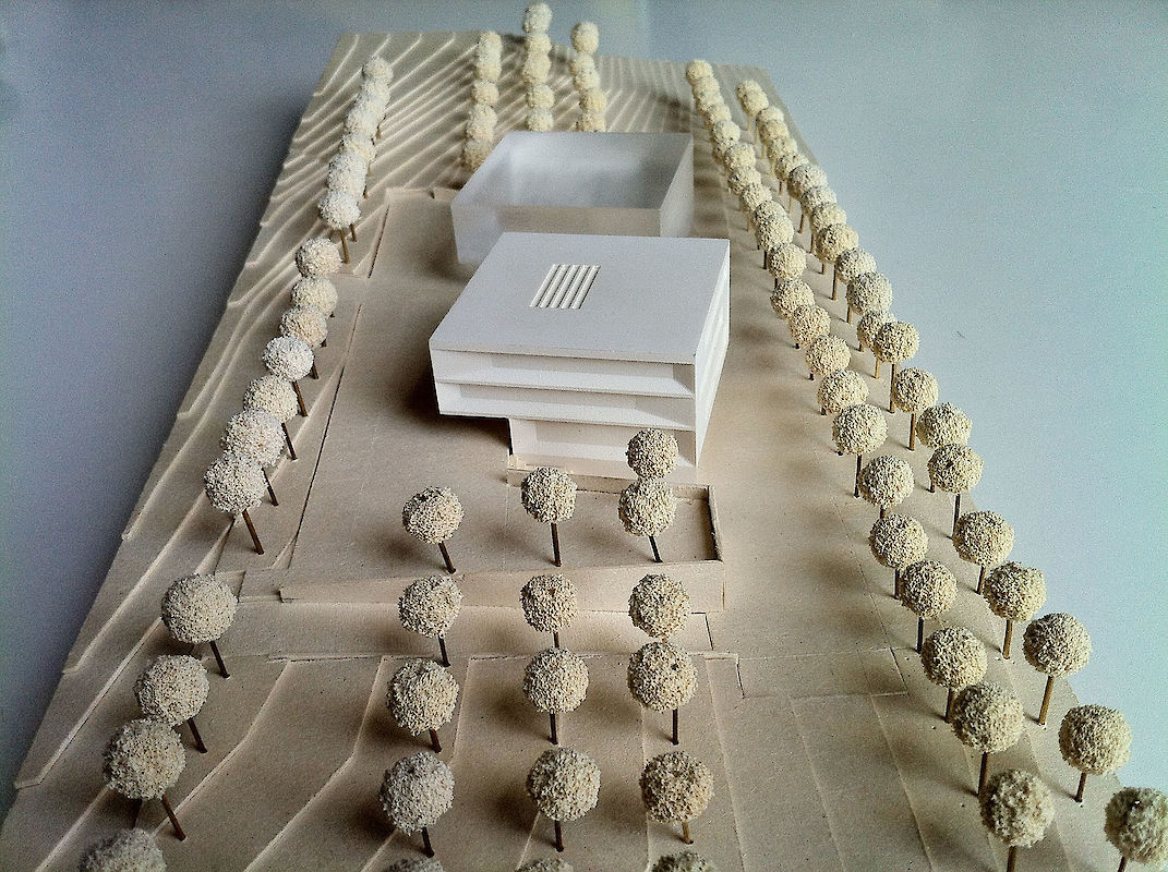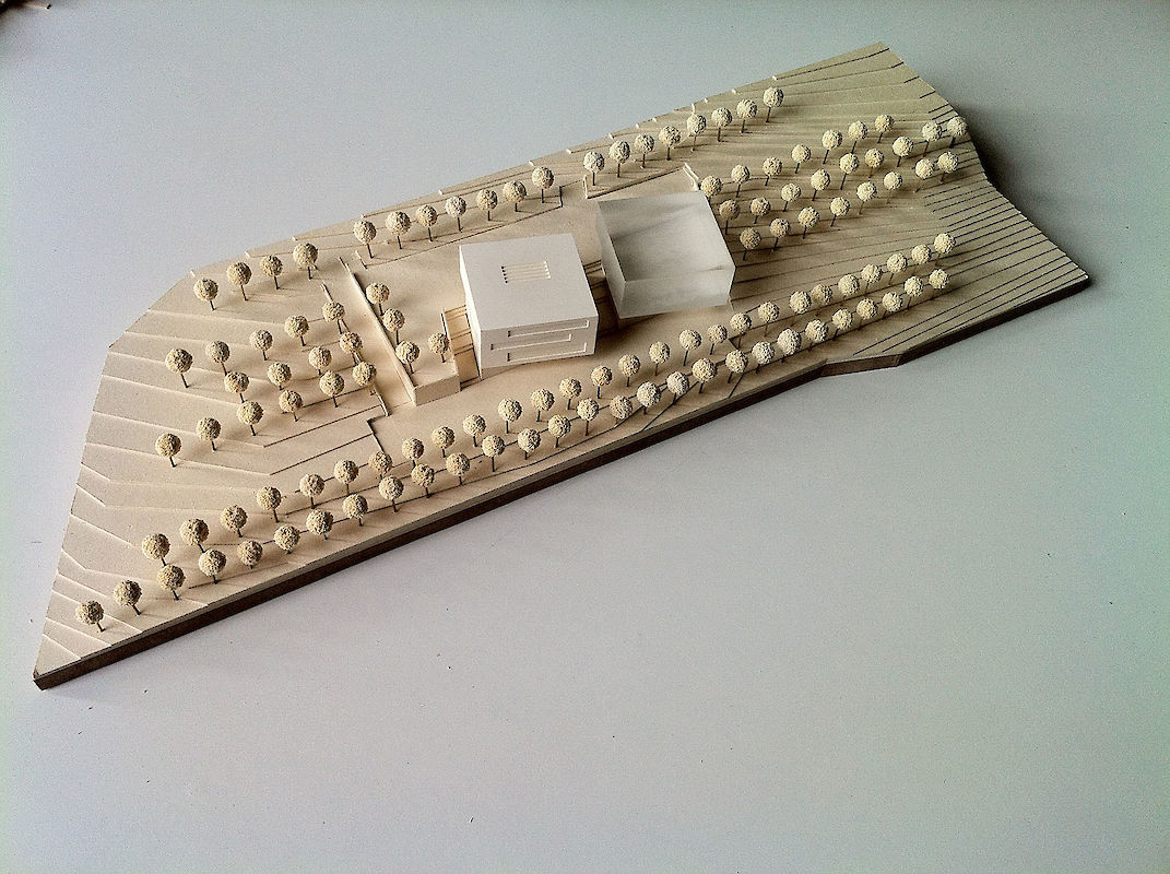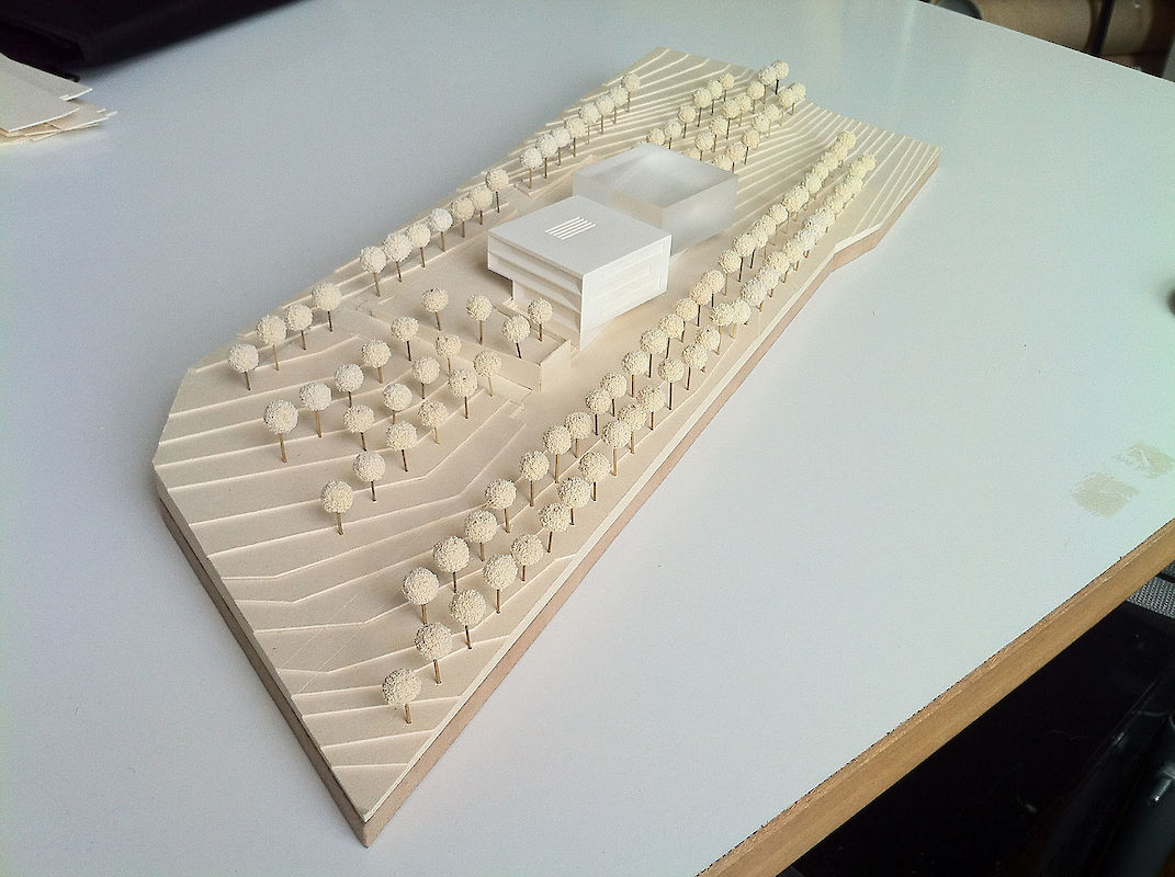 Von Niederprüm kommend, fährt man direkt auf das Verwaltungs- und Betriebsgebäude zu. Die Nordost-Fassade des würfelartigen Gebäudes wendet sich dem Ankommenden zu. Durch die Hanglage hat das Gebäude talseitig vier Geschosse, bergseitig sind es drei Geschosse. Dem Höhenverlauf der Erschließungsstraße folgend zweigt zunächst auf 443m üNN. der Weg zum Betriebshof ab und auf 447m üNN. wird die Besucherterrasse erschlossen, ohne Überkreuzung der unterschiedlichen Nutzungserschließungen. Zwischen Betriebshof und Besucherterrasse sind die Außenanlagen terrassiert mit Treppenverbindungen, Wasserbecken und Aufenthaltsnischen angelegt. Sämtliche Niveaus folgen in ihrer Höhenlage weitgehend dem natürlichen Hangverlauf. Die geringen Höhenunterschiede zwischen angrenzenden Hangflächen und terrassierten Außenanlagen oder Trassen gleicht eine niedrige, abgetreppte Böschungswand entlang der Anlagenaußenkante aus. Entlang der nördlichen Grundstücksgrenze sollen Baumgruppen den angrenzenden Wald mit neuen Grünanlagen vermitteln. Entlang der südlichen Grundstücksgrenze bildet eine doppelte Baumreihe die erste Alleenhälfte der Erschließungsstraße, welche künftig auch die südlich angrenzenden Gewerbeflächen anbinden wird.