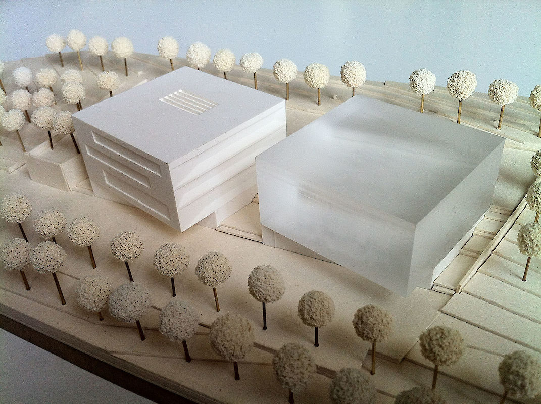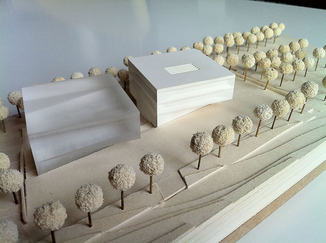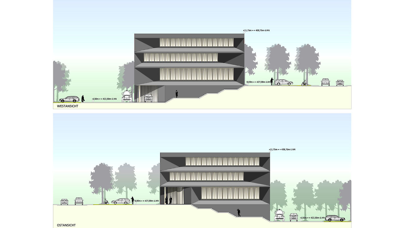 Ebenfalls dem Betriebshof zugeordnet liegen extern Lagerräume, als Sockelgeschoss einer künftigen Erweiterung. Der Betriebshof und die Besucherterrasse dienen somit auch als äußere Erschließung einer künftigen Erweiterung. Die innere Erschließung des 2.Bauabschnitts knüpft künftig im 1.OG über eine Verbindungsbrücke und im UG über einen tagesbelichteten Flur an das Flursystem des 1.Bauabschnitts an. Beide Bauabschnitte ergänzen sich somit zu einem attraktiven, campusartigen Ensemble. Selbstverständlich ist der erste Bauabschnitt auch alleine funktionsfähig und wirtschaftlich in Bezug auf Planung, Herstellung und Betrieb.