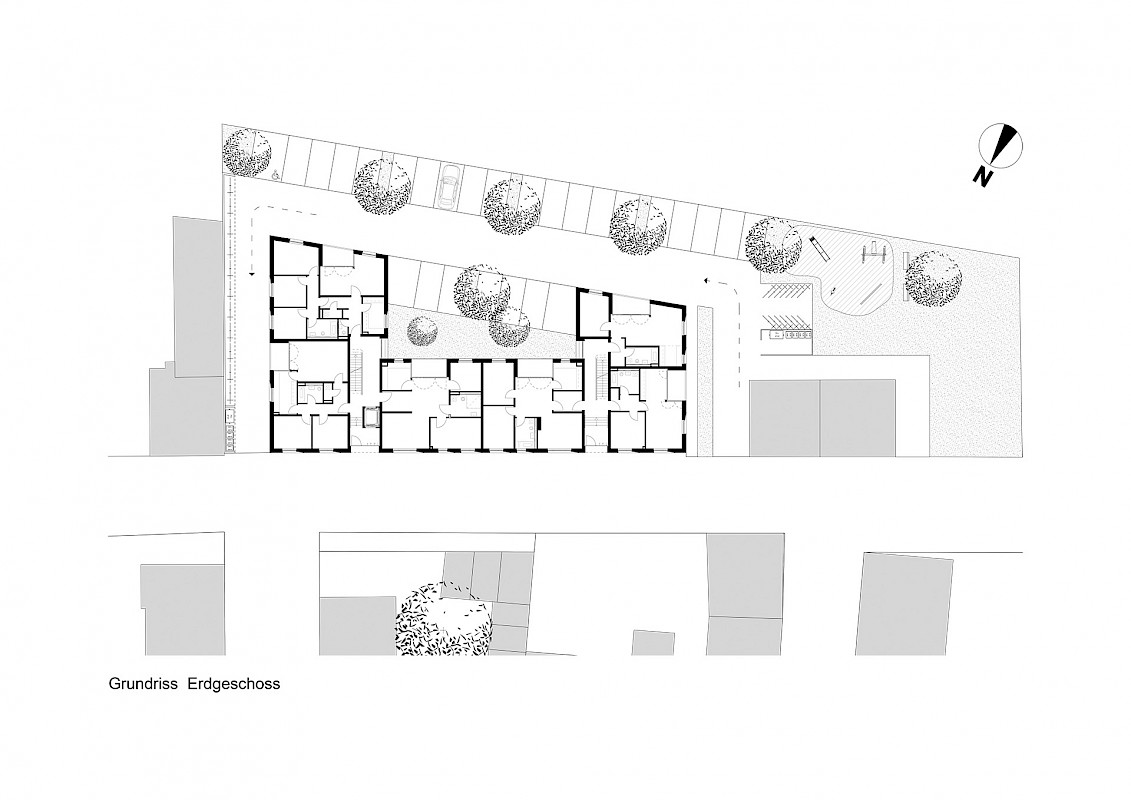 Die über eine Gebäudeumfahrt erschlossene Hoffläche an der Südseite nimmt Funktionen wie PKW-Stellplätze auf, und an den Rändern abgezäunte Stellflächen für Mülltonnen. Im Innenhof liegen, zu den PKW-Stellplätzen durch einen Grünstreifen mit pflegeleichten Sträuchern abgetrennt, die Abstellflächen für Fahrräder. Auch die Parkplätze sind durch Grünstreifen mit Sträuchern und Bäumen unterbrochen. Der Kinderspielplatz im Grünen liegt hinter dem Nachbargebäude, das ebenfalls dem Bauherrn gehört.