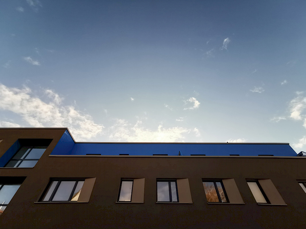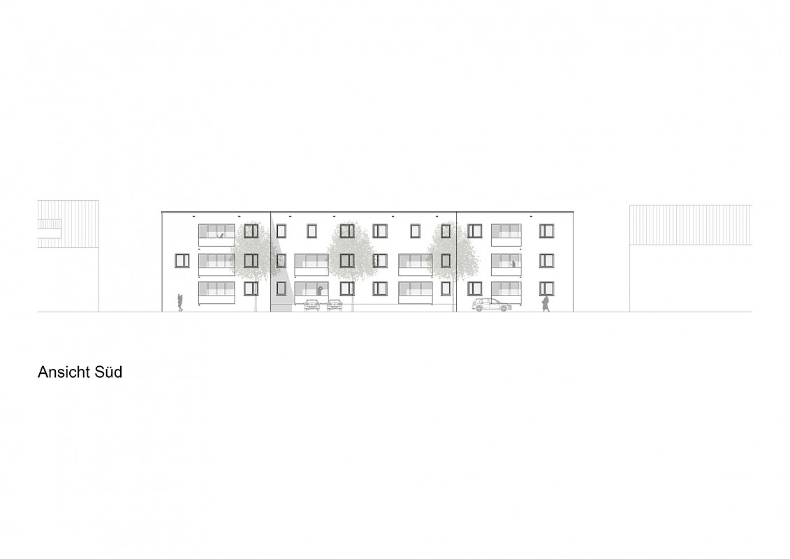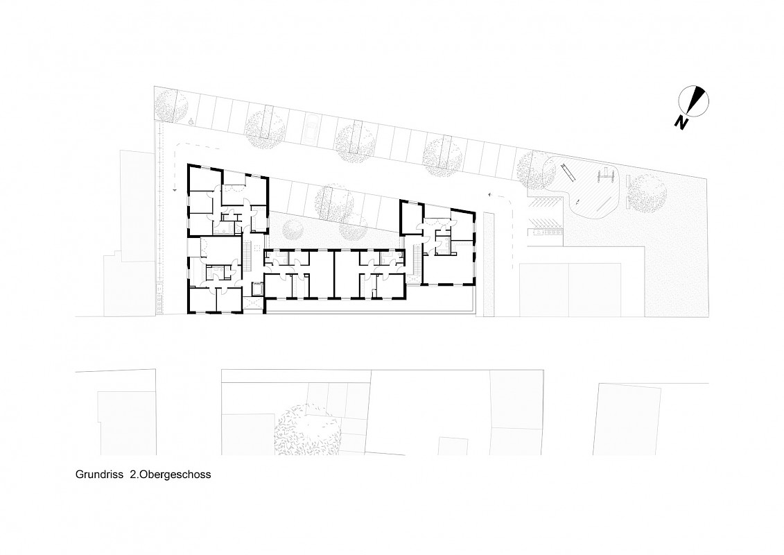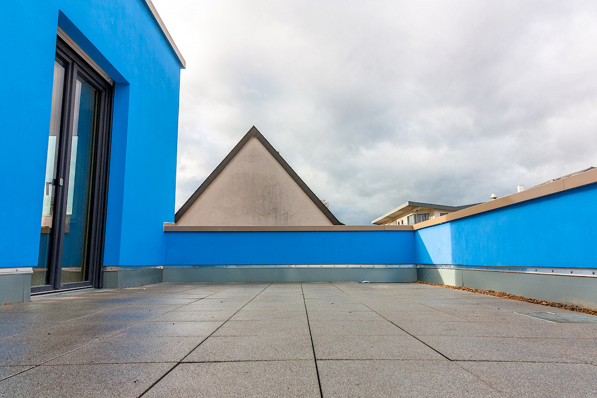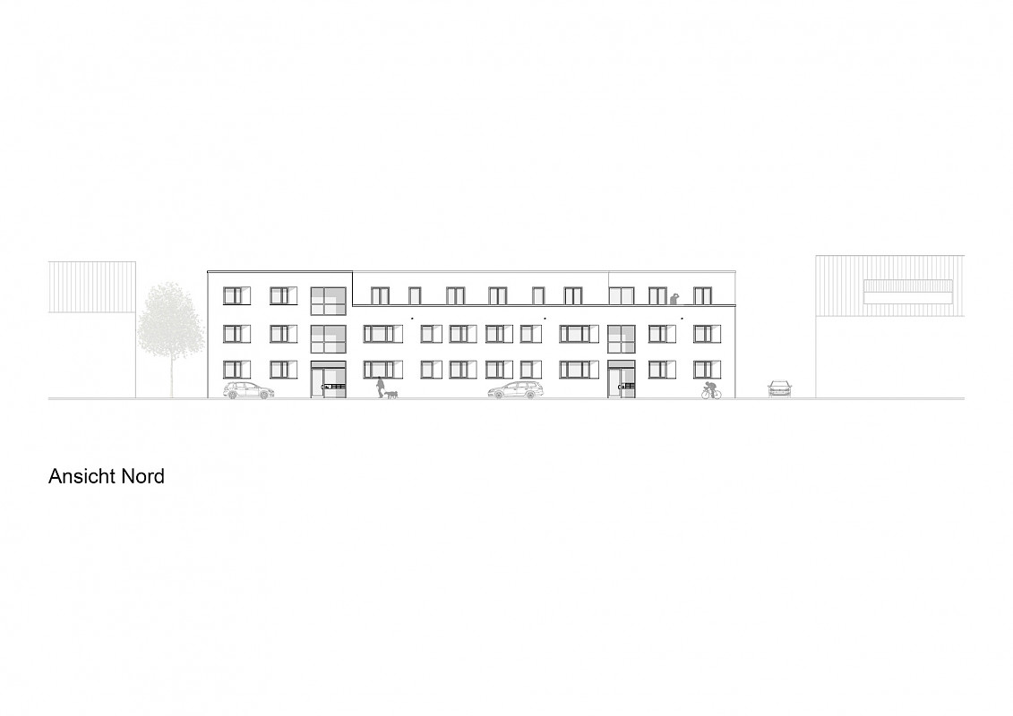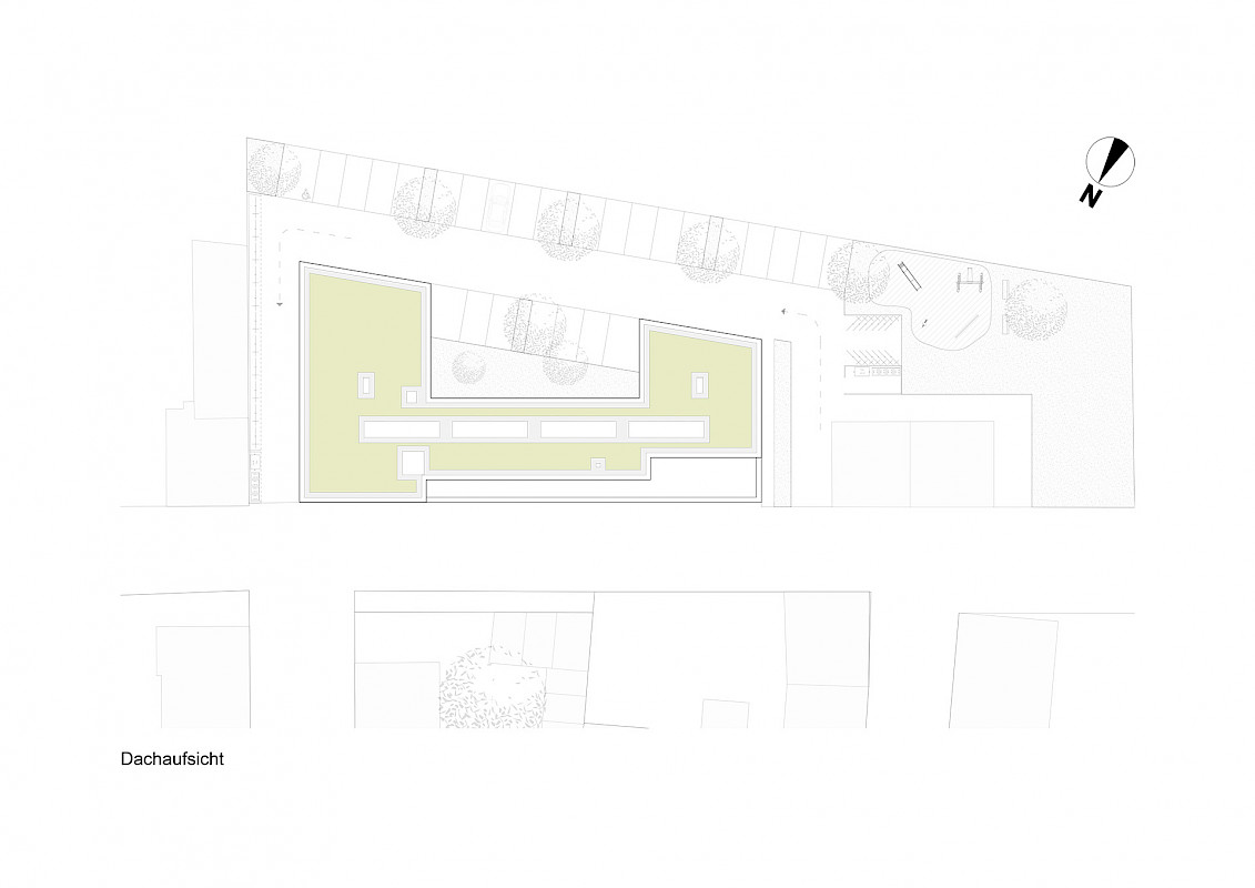 Durch das zweifach rückspringende Staffelgeschoss an der 43m langen Nordseite entsteht der Eindruck einer 2-Geschossigkeit, welche den Straßenraum nicht zu sehr verdunkelt. Die Rücksprünge bilden Dachterrassen und ermöglichen einen wunderschönen Blick über den alten Ortskern von Frei-Weinheim und den angrenzenden Rheingau. Durch die Nord-West Ausrichtung kann man auf den Dachterrassen die Abendstunden bei untergehender Sonne genießen.