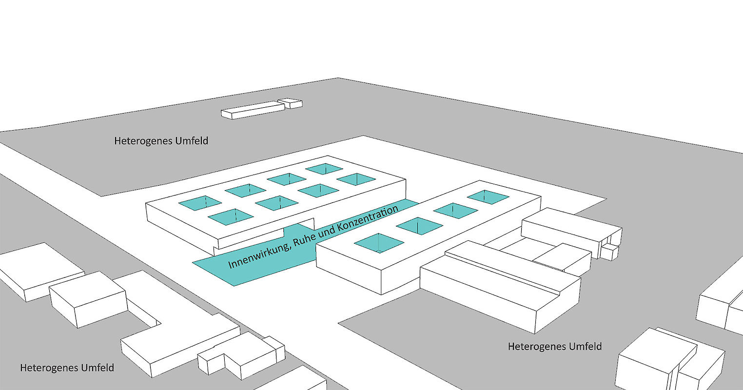 Zur Steigerung der Wiedererkennung und Orientierung innerhalb des Gebäudekomplexes wird eine klare Differenzierung in der Innenhofausgestaltung vorgeschlagen. So bieten diese individuell gestalteten Räume abwechslungsreiche Potentiale als Treffpunkte, grüne Oasen, Veranstaltungsflächen oder ähnliche Nutzungen. Dementsprechend können sich Mitarbeiter in einen Hof zurückziehen, der mit einer intensiven Bepflanzung ein grünes Klima mit viel Aufenthaltsqualität schafft. Der markante Wasserhof holt einfach über den Wasserspiegel den Himmel in den Innenhof.