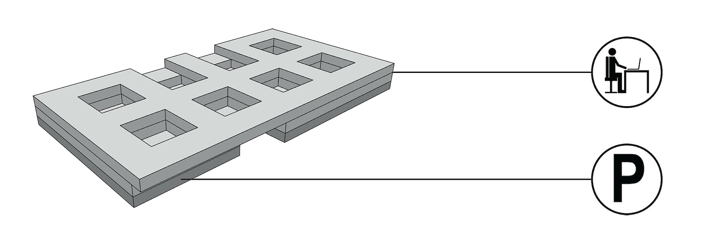 Durch den Tiefgaragenverzicht und die PKW-Unterbringung im EG wird zwar mehr Grundstücksfläche beansprucht aber insgesamt wird die Baumaßnahme wirtschaftlicher (kaum Tiefbau, Rampen-Entfall, etc.). Zudem sind Betriebsabläufe effizienter/ logischer organisierbar (Mitarbeiter erreichen direkt unter dem Arbeitsplatz wettergeschützt ihren Stellplatz).