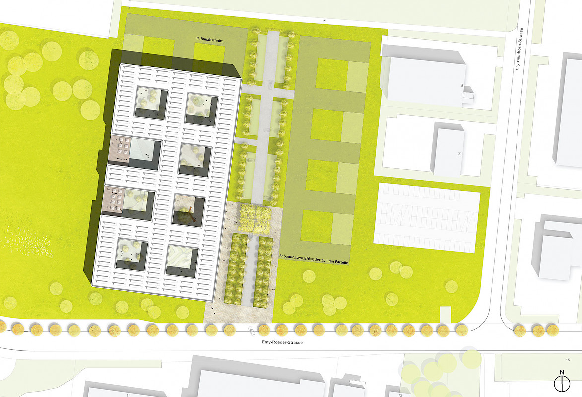 Ein großzügiger Boulevard mit Pflanzflächen führt Besucher über hochwertige Natursteinflächen zum Eingangshof. Architektonisch angeordnete Gehölzgruppen aus schirmförmigen Felsenbirnen (starke Empfangsgeste) bilden ganzjährig im Zusammenspiel mit repräsentativen Stauden- u. Gräserpflanzungen wechselnde Bilder durch Blüh- u. Herbstaspekte. Das formale Baumdach auf der Piazetta markiert den Haupteingang und den Übergang zu den Parkplätzen. Die Übersetzung der quadratischen Innenhofform auf die Baumgruppe schafft das Zusammenspiel zwischen Innen- u. Außenraum sowie ein Signet für die Gesamtanlage. Der Platzbelag zieht sich bis in den Erschließungshof und das Eingangsfoyer und erhält dort durch einen signifikanten Solitärbaum und ein besonderes Sitzelement einen Empfangscharakter mit Aufenthaltsqualität. Anschließend an das Baumdach reihen sich 50 Parkplätze mit Rasenfugenplattenbelag auf. Zur Versiegelungsminimierung sind die Stellplätze auf 4,30m verkürzt, der 70cm Überhang ragt in eine zur verbesserten Regenwasserversickerung leicht abgesenkte Grünfläche. Die linear angeordneten Felsenbirnen führen bis ans Stellplatzende. Formschnitthecken schließen dort den Erschließungsboulevard ab.