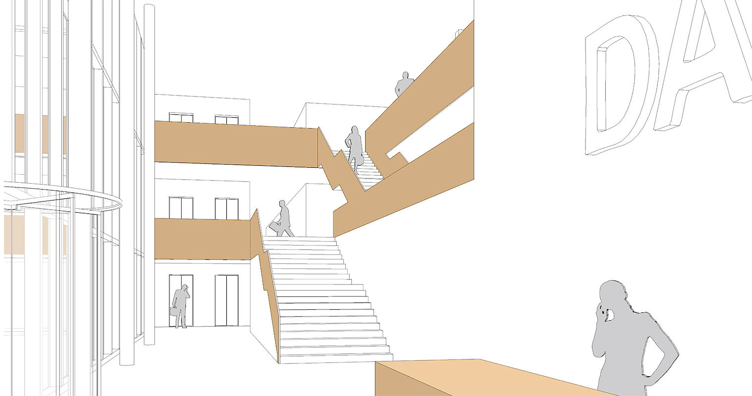 Um in diesem heterogenen Umfeld einen Ort der Ruhe und Konzentration zu schaffen wird ein Höchstmaß an räumlicher Differenzierung und Innenwirkung angestrebt. Ein großer Erschließungsboulevard differenziert stadträumlich den Bereich zwischen der DAL-Zentrale und einem weiteren BA gegenüber dem undefinierten Umfeld. Von diesem Boulevard leitet eine arkadenartige Wegeführung zum Eingangshof mit der gebäudehohe Foyerhalle. Durch die Gebäudegliederung in einen EG-Sockel als Parkebene und darüber liegenden Büroebenen sind die Funktionen idealtypisch differenziert. Die Parkplätze bleiben weitestgehend verborgen und im Außenraum können stadträumliche Qualitäten entwickeln werden.