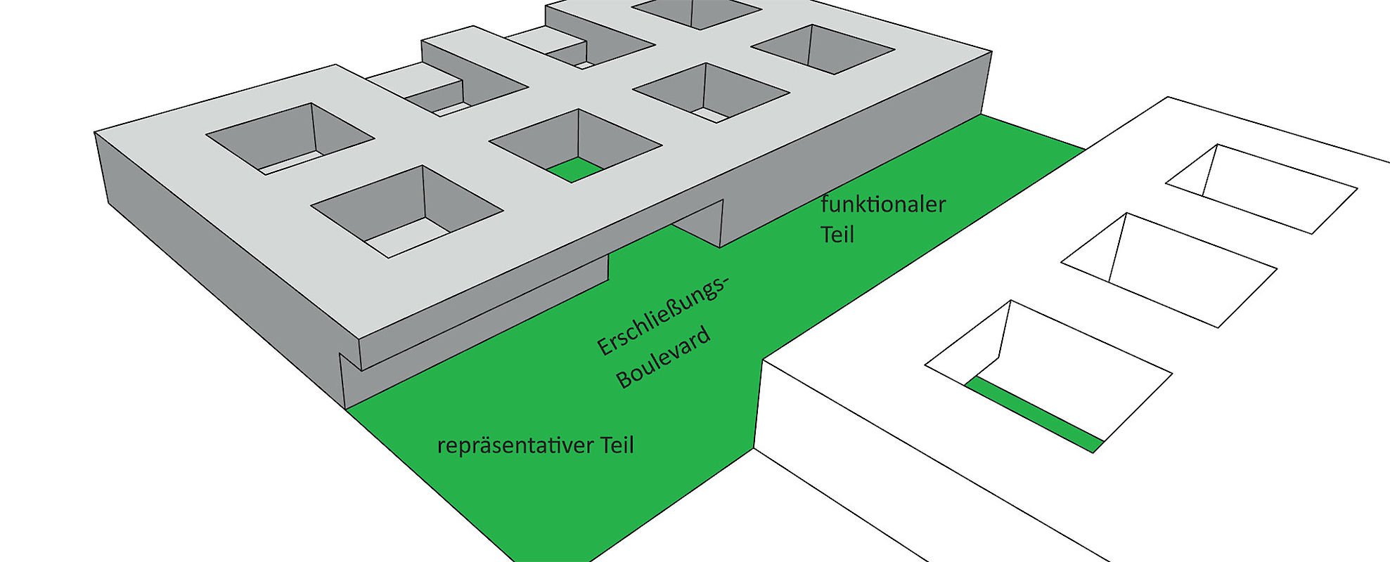 In der Außenwirkung kommt die Gebäudegliederung mit Sockelgeschoss und Obergeschossen als architektonisches Programm zum Ausdruck. Durch die regelmäßige Anordnung von Atrien und durch die Wegeführung hat das Gebäude eine überraschend offene Innenwirkung. Von der repräsentativen Foyerhalle mit zentralem Empfang und attraktivem Wartebereich führen große Treppen und Aufzüge zu den Magistralen im 1. und 2.OG. Diese Haupterschließungen führen an den Innenhöfen und den Kommunikationsbereichen (Konferenz-, Lounge-Bereiche, etc.) vorbei und leiten in die einzelnen Gebäudetrakte über. Aufgrund der günstigen Gebäudestruktur und dem 1,30m Raster lassen sich wirtschaftlich-flexible Bürokonzepte realisieren und auch wirtschaftliche PKW-Stellplätze im EG. Zudem sind separate Nutzungseinheiten abtrennbar. Die Gesamtanlage wurde so platziert, dass künftig an der Nordfassade ein 2.BA mit ca. 1.500m2 BGF inkl. Stellplätzen angeschlossen werden kann. Der östliche Grundstücksteil ist als separate Parzelle abtrennbar.