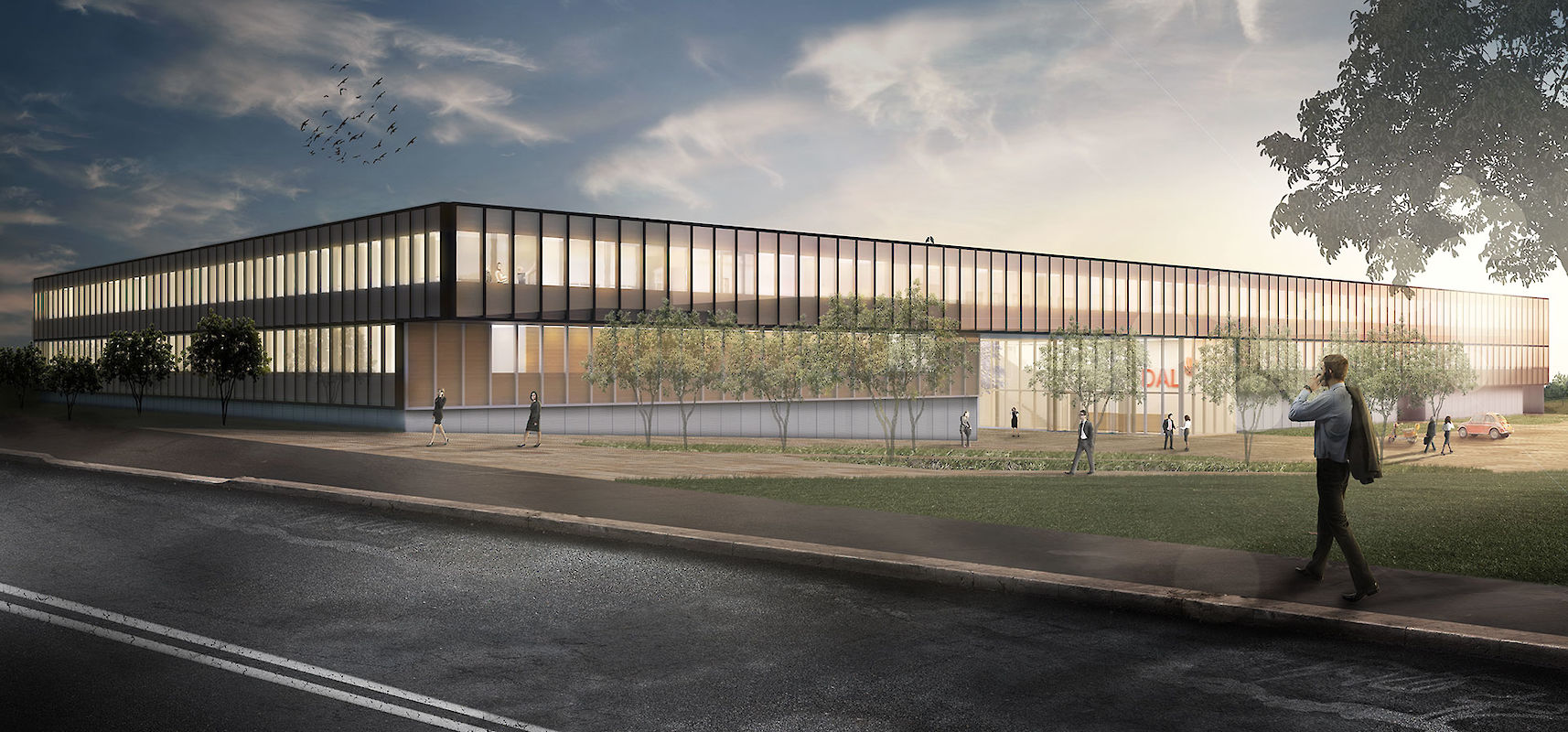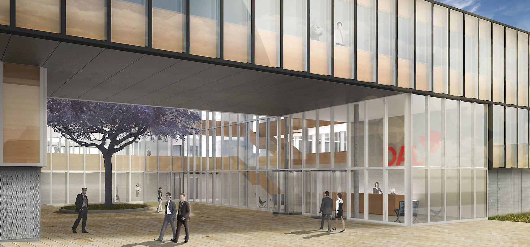 Um in diesem heterogenen Umfeld einen Ort der Ruhe und Konzentration zu schaffen wird ein Höchstmaß an räumlicher Differenzierung und Innenwirkung angestrebt. Ein großer Erschließungsboulevard differenziert stadträumlich den Bereich zwischen der DAL-Zentrale und einem weiteren BA gegenüber dem undefinierten Umfeld. Von diesem Boulevard leitet eine arkadenartige Wegeführung zum Eingangshof mit der gebäudehohe Foyerhalle. Durch die Gebäudegliederung in einen EG-Sockel als Parkebene und darüber liegenden Büroebenen sind die Funktionen idealtypisch differenziert. Die Parkplätze bleiben weitestgehend verborgen und im Außenraum können stadträumliche Qualitäten entwickeln werden.