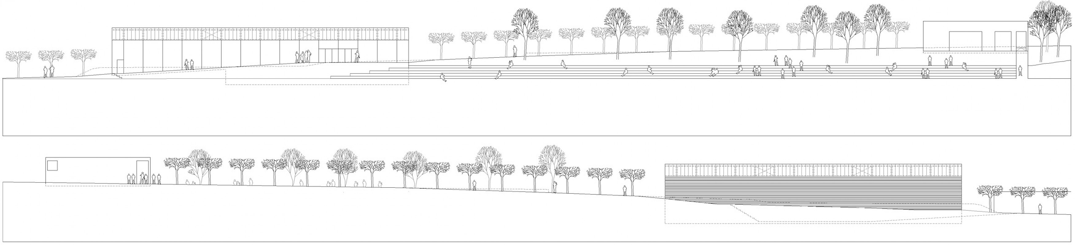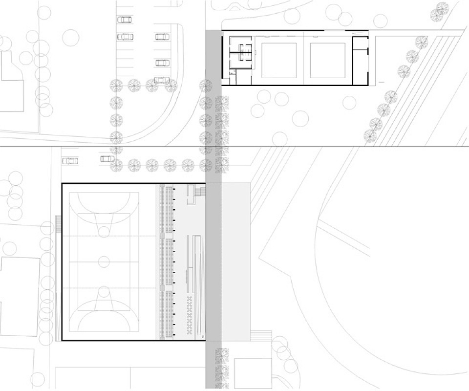 Sport- und Judohalle werden aufgrund der unterschiedlichen Nutzungsanforderungen räumlich getrennt und hinsichtlich der Außenräume differenziert. Die Sporthalle für Mannschaftssportarten und publikumsaktive Wettbewerbe profitieren vom nahtlosen Übergang von Innen nach Aussen – die Geländetopographie setzt sich im Foyer als Erschließung fort. Das körperhafte Dachvolumen der Sporthalle mit seiner transluzenten Oberfläche greift über die gesamte Wegesbreite und bezieht somit den Aussenraum in den Foyerbereich mit ein. Demgegenüber erhält die Judohalle einen introvertierten und meditativen Innenhof.