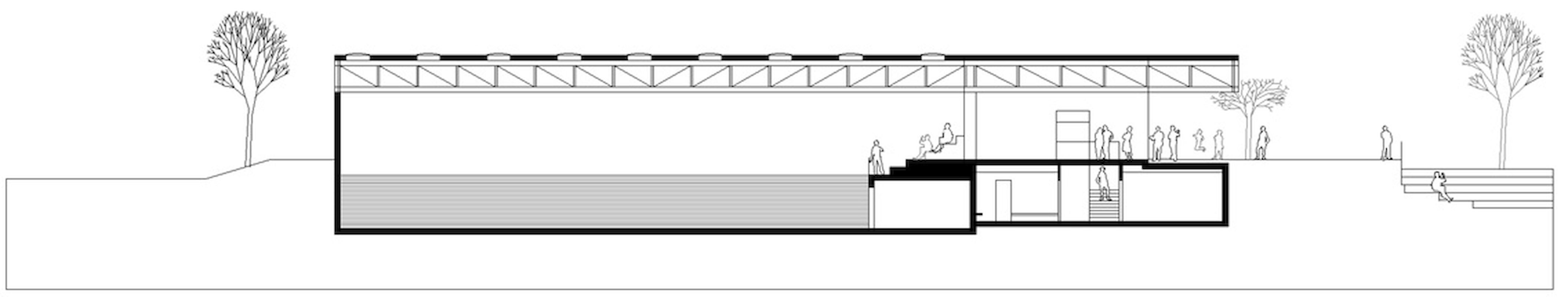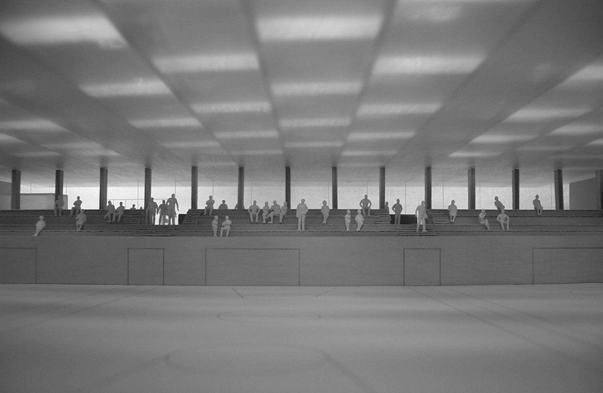 Sport- und Judohalle werden aufgrund der unterschiedlichen Nutzungsanforderungen räumlich getrennt und hinsichtlich der Außenräume differenziert. Die Sporthalle für Mannschaftssportarten und publikumsaktive Wettbewerbe profitieren vom nahtlosen Übergang von Innen nach Aussen – die Geländetopographie setzt sich im Foyer als Erschließung fort. Das körperhafte Dachvolumen der Sporthalle mit seiner transluzenten Oberfläche greift über die gesamte Wegesbreite und bezieht somit den Aussenraum in den Foyerbereich mit ein. Demgegenüber erhält die Judohalle einen introvertierten und meditativen Innenhof.