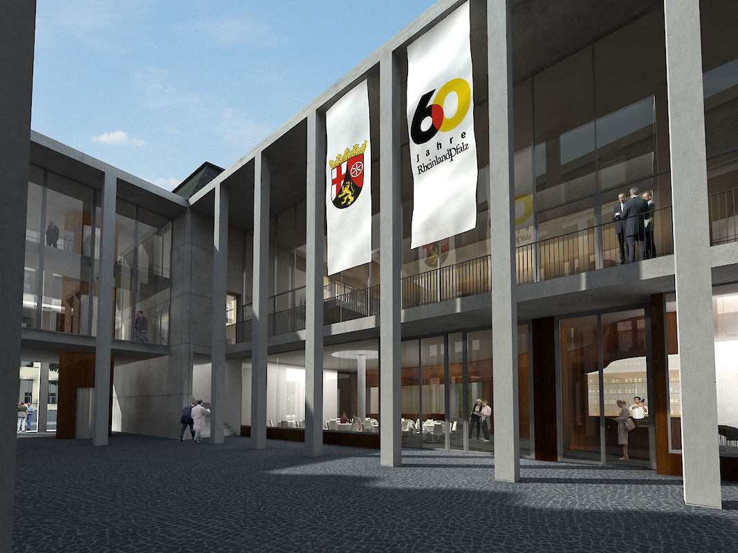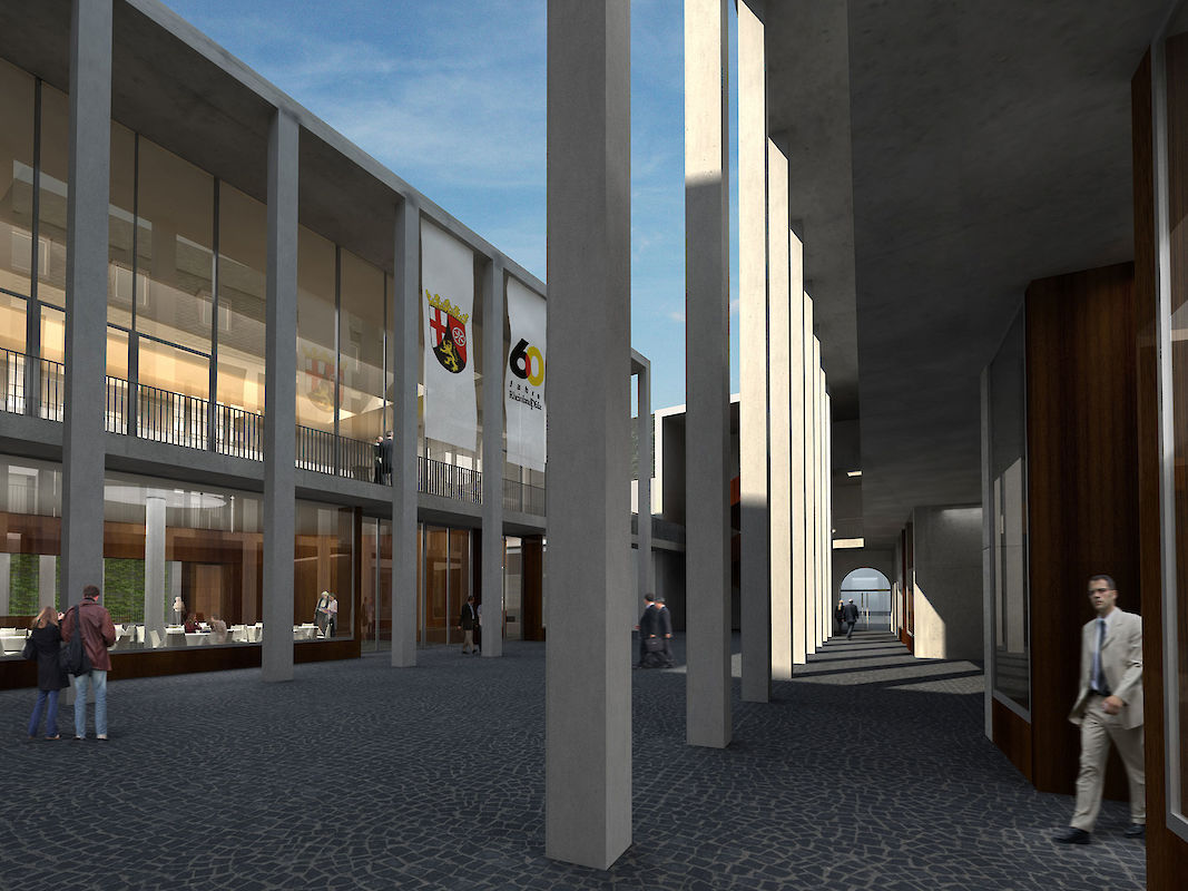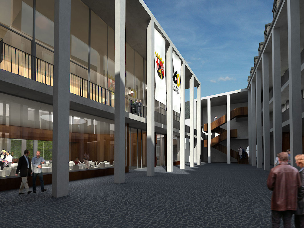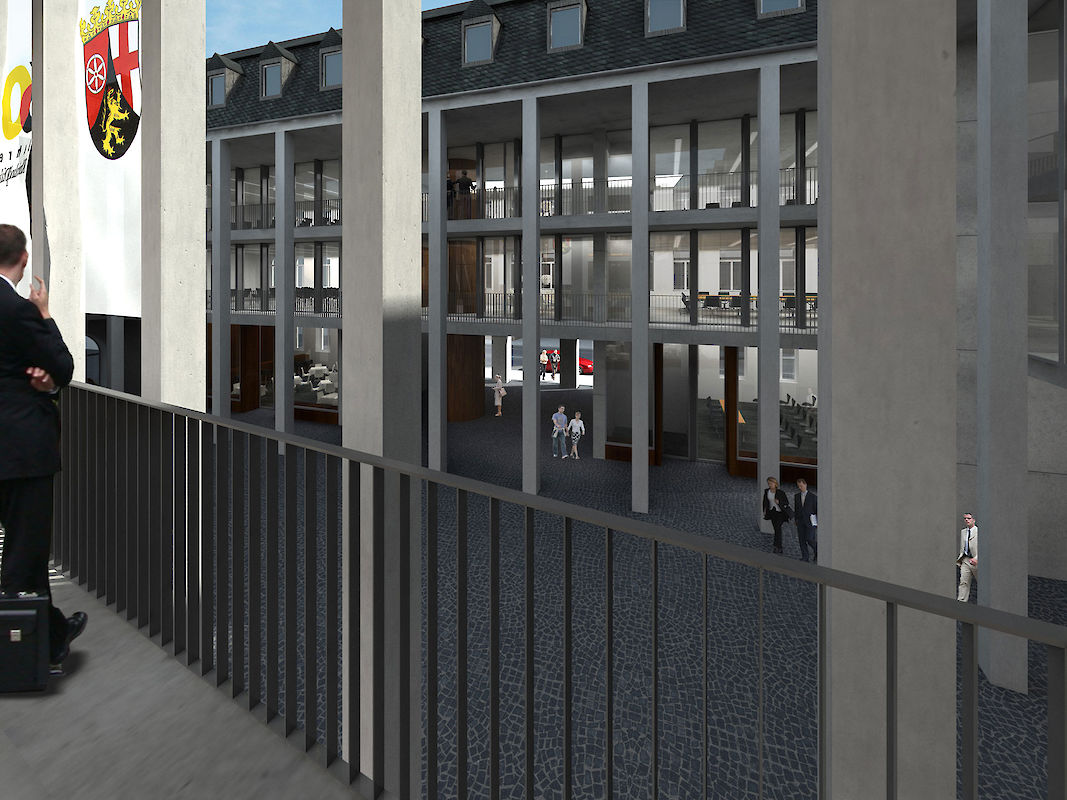Das Gesamtensemble erhält neben dem großen Hof des Landesmuseums, drei kleinere Höfe im Bereich des neuen Eltzer Hofes und den angrenzenden Nutzungen des Landesmuseums. Annähernd der gesamte Innenbereich des Wettbewerbsgebietes wird künftig wieder zu einer großen durchgängigen Abfolge von Innenhöfen mit einem zentralen Hof. Es wird somit ein bewährtes Prinzip innerstädtischer Paläste fortgeführt – das Herzstück bildet der große Innenhof, auf diese orientieren sich die Säle und Erschließungen. Auch hier wird der große Saal in das Obergeschoß verlegt. Analog zu den Beispielen aus der Baugeschichte wird der Aufgang von der Platzfläche zum Saal inszeniert, über die Arkaden führen Treppen zu einer Loggia als Verteiler zu den unterschiedlichen Gebäudetrakten. Über die Loggia teilen sich Veranstaltungsinhalte auch dem Stadtraum mit, d.h. neben der Verteilerfunktion und der Innenwirkung, dient die Loggia auch der Außenwirkung des künftigen Veranstaltungsortes Eltzer Hof.
