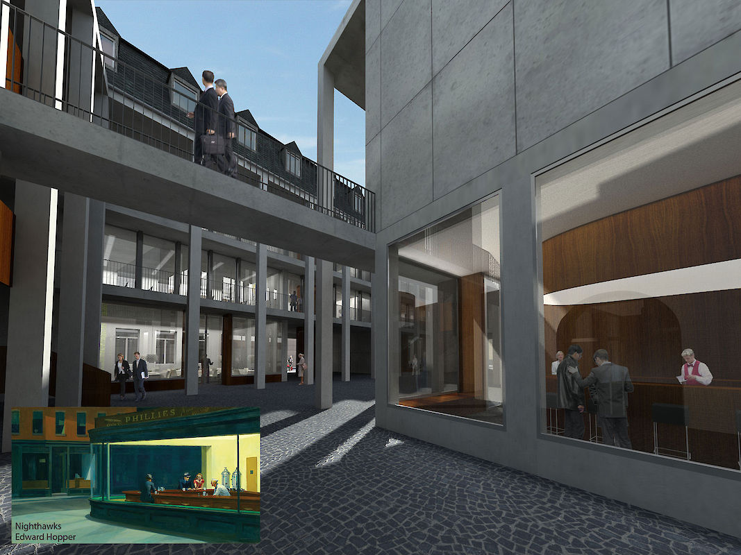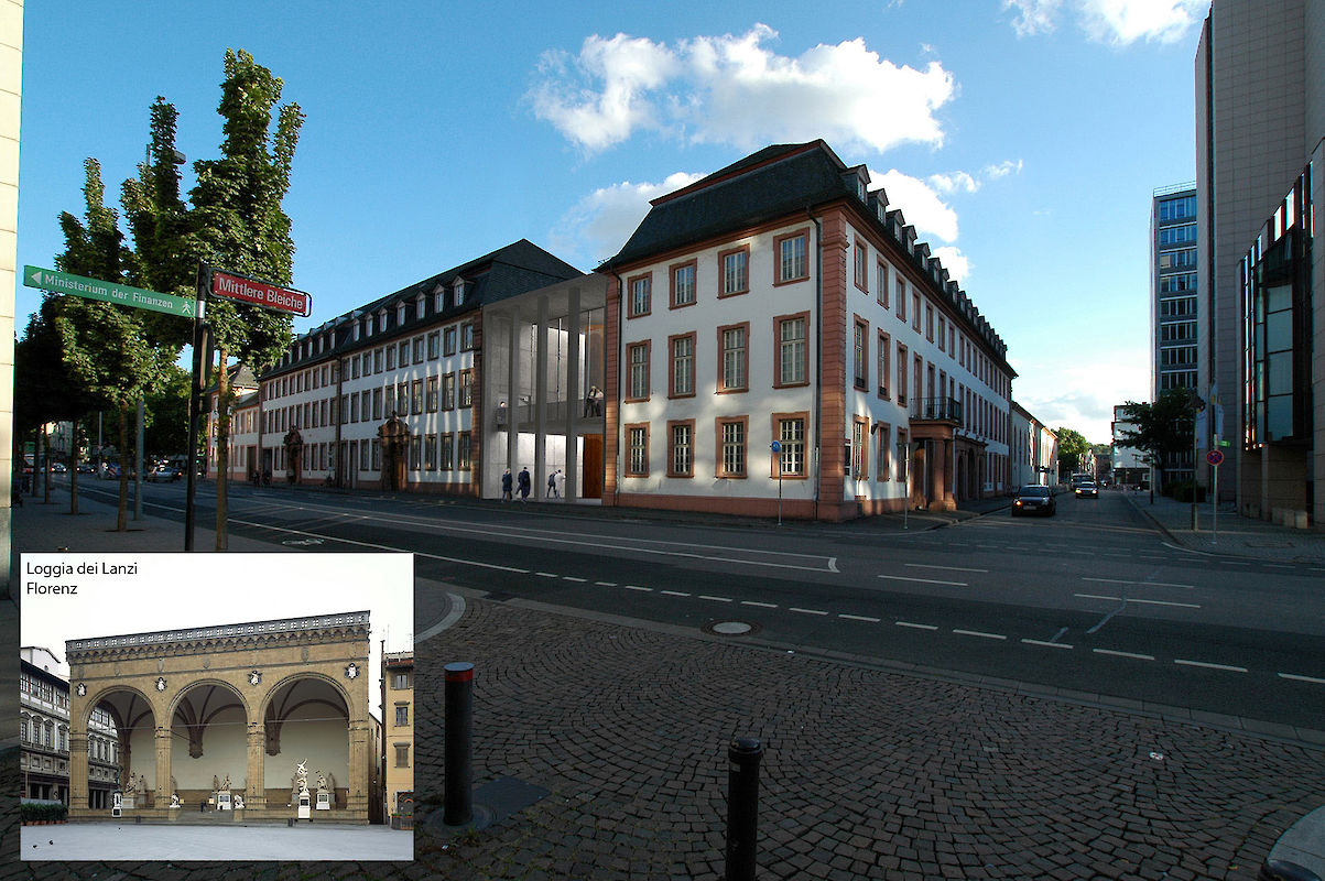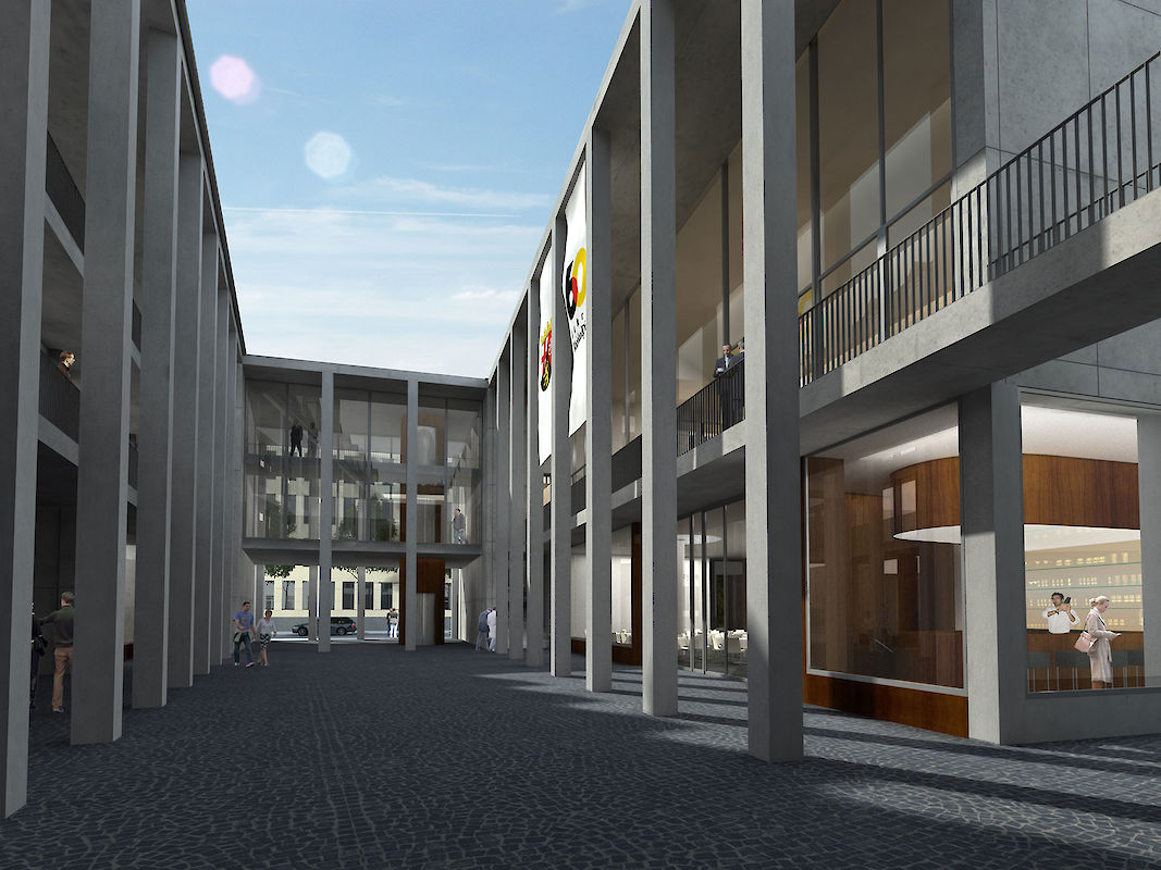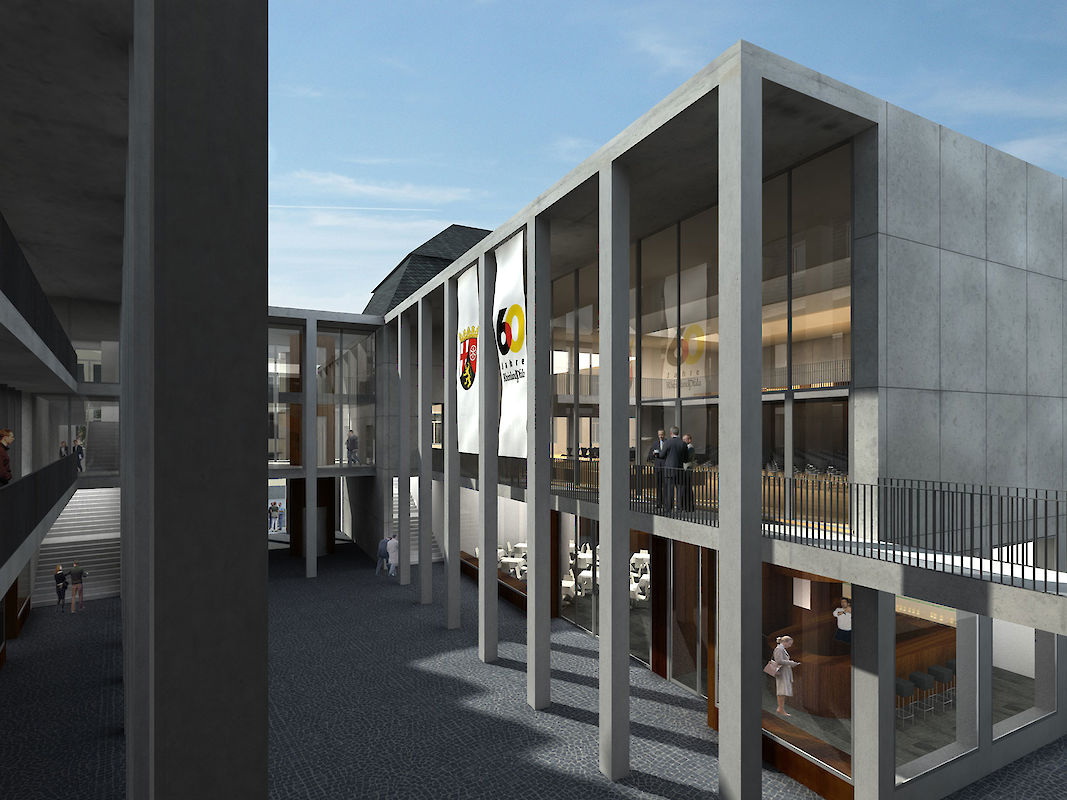 Das Gesamtensemble erhält neben dem großen Hof des Landesmuseums, drei kleinere Höfe im Bereich des neuen Eltzer Hofes und den angrenzenden Nutzungen des Landesmuseums. Annähernd der gesamte Innenbereich des Wettbewerbsgebietes wird künftig wieder zu einer großen durchgängigen Abfolge von Innenhöfen mit einem zentralen Hof. Es wird somit ein bewährtes Prinzip innerstädtischer Paläste fortgeführt – das Herzstück bildet der große Innenhof, auf diese orientieren sich die Säle und Erschließungen. Auch hier wird der große Saal in das Obergeschoß verlegt. Analog zu den Beispielen aus der Baugeschichte wird der Aufgang von der Platzfläche zum Saal inszeniert, über die Arkaden führen Treppen zu einer Loggia als Verteiler zu den unterschiedlichen Gebäudetrakten. Über die Loggia teilen sich Veranstaltungsinhalte auch dem Stadtraum mit, d.h. neben der Verteilerfunktion und der Innenwirkung, dient die Loggia auch der Außenwirkung des künftigen Veranstaltungsortes Eltzer Hof.