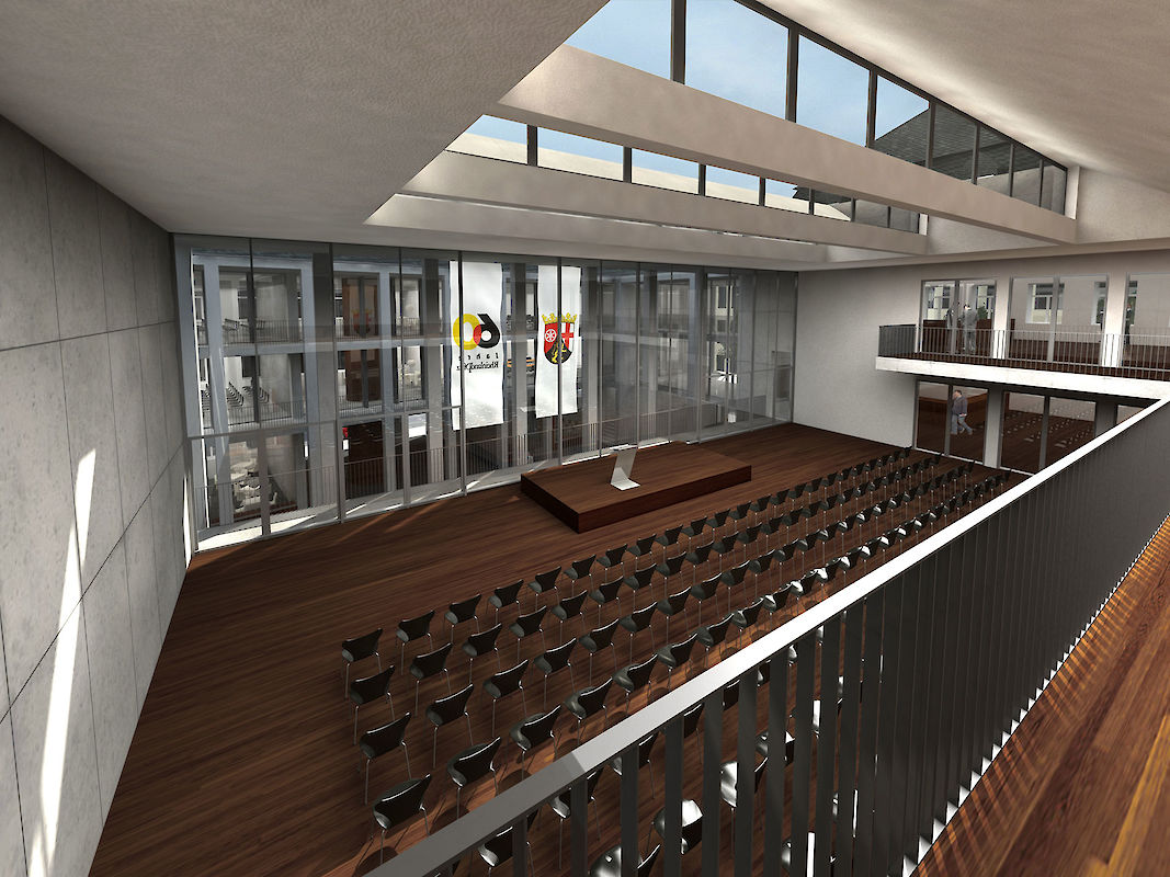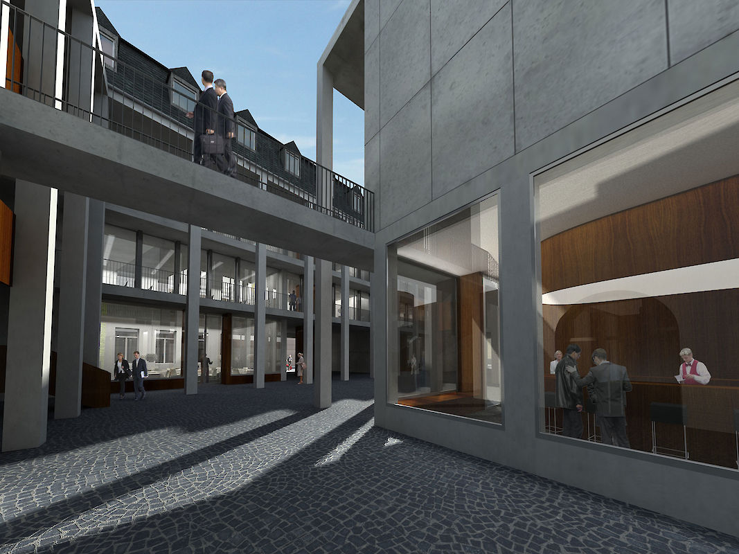Fassade als Schicht der räumlichen Übergänge nicht als Raumabgrenzung. Das gewählte Architekturthema ist der Übergang von Räumen, nicht die formale Auseinandersetzung mit den historischen Fassaden. Lediglich das Fassadenraster der historischen Fassaden gibt die Rhythmik für die architektonische Ausprägung der Innenbereiche vor. Dort wird die Fassade, durch die Betonung der Vertikalen in einer Reihung gebäudehoher Stützen und das Zurücksetzen der Deckenplatten, konsequent von einer flächigen zu einer räumlichen Fassade transformiert. Diese tiefe, galerieartig umlaufende Fassadenschicht schafft auf allen Ebenen einen gleitenden Innenraum- Außenraumübergang mit hoher Aufenthaltsqualität. Die Säulenzwischenräume bieten Raum für vielfältige Inszenierungen auf den Galerien und der Innenhoffläche. Die Galerien werden zu Podien, welche je nach Veranstaltung, vom Festsaal, von den Tagungsräumen oder von den Büros aus bespielt werden können, mit Fahnen, Transparenten, Installationen, Dekorationen und Botschaften. Der architektonische Ausdruck ergibt sich somit aus dem kalkulierten Raumgefüge, dessen Wahrnehmung zeitlos ist.