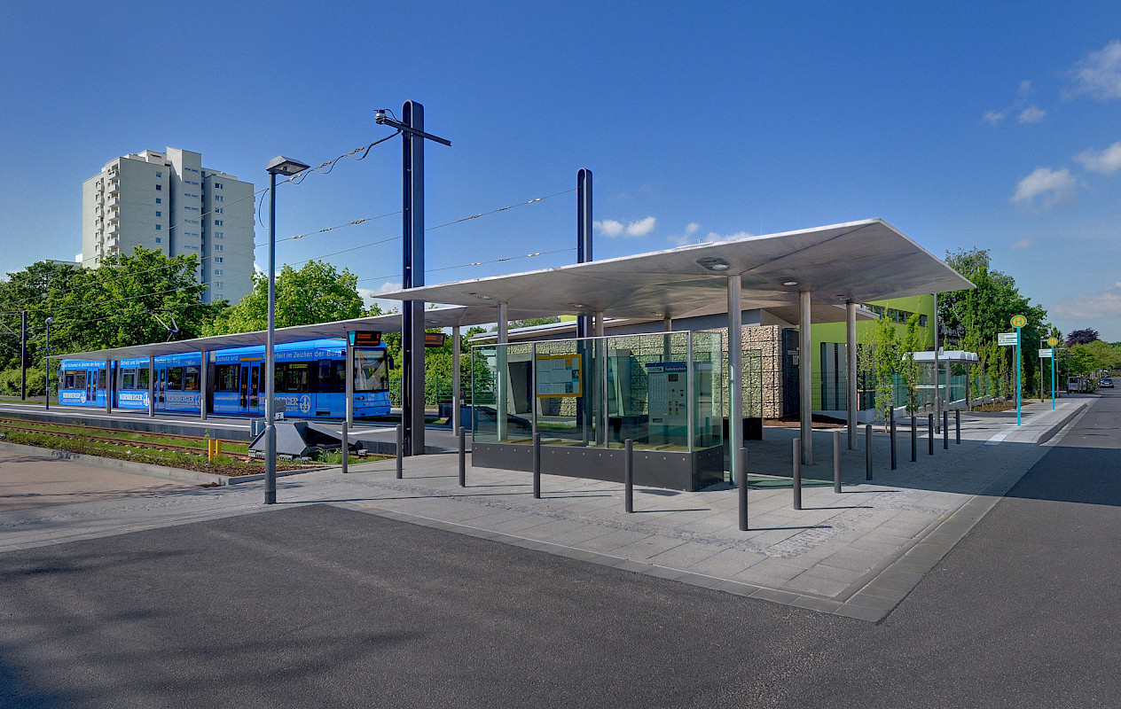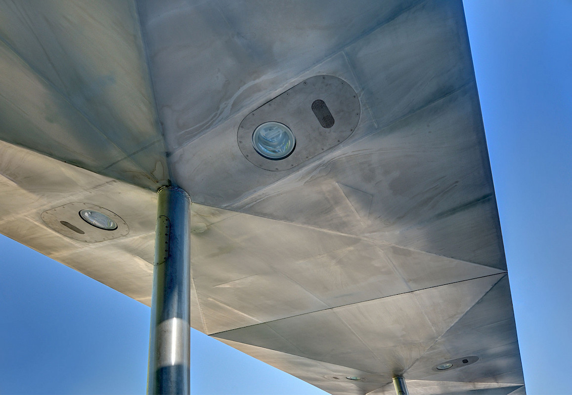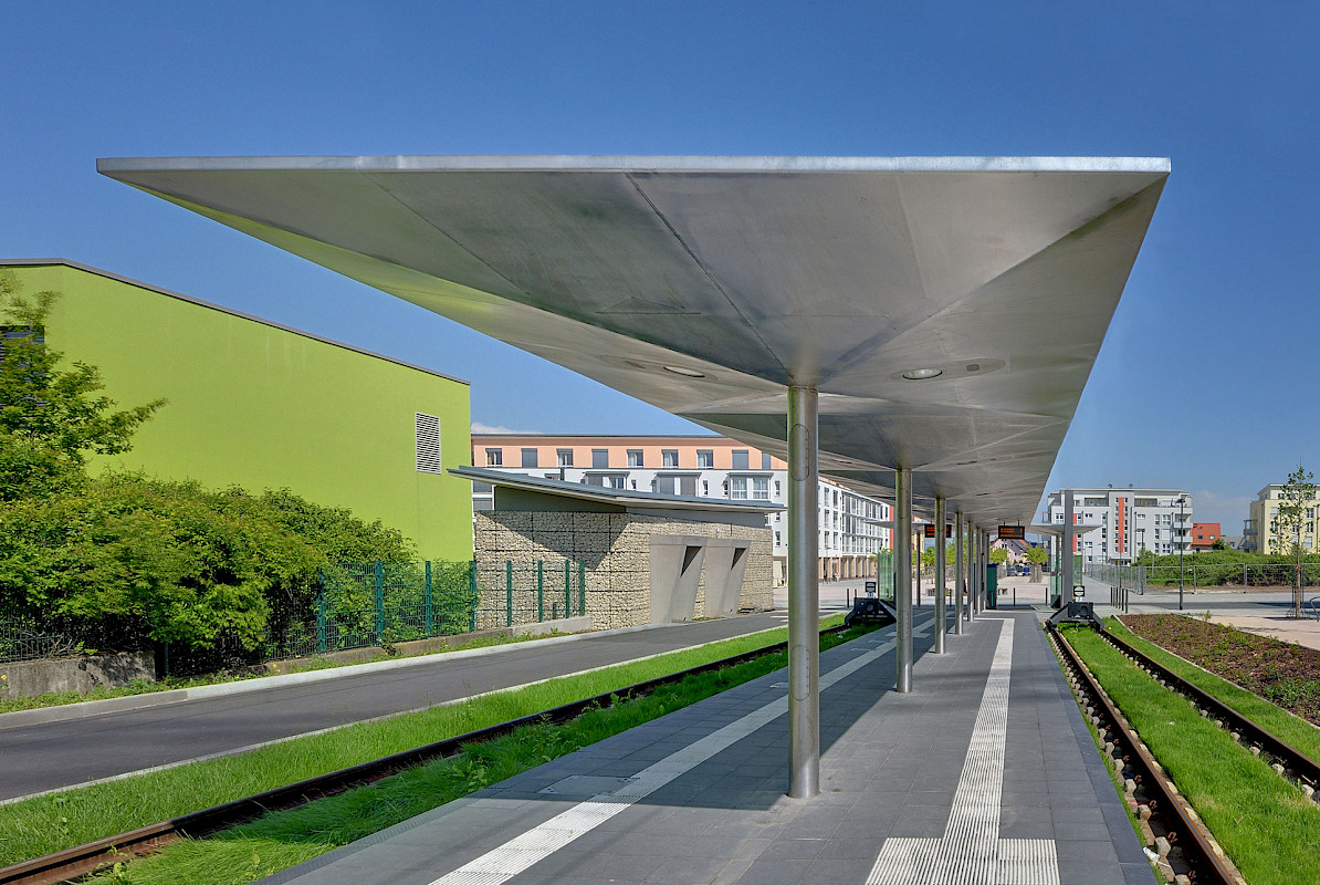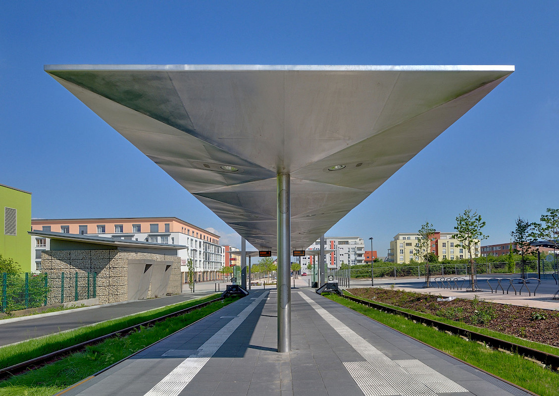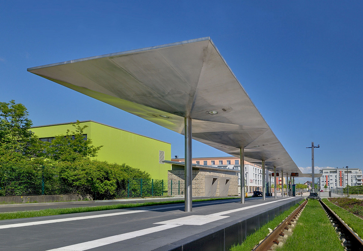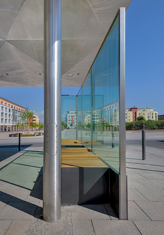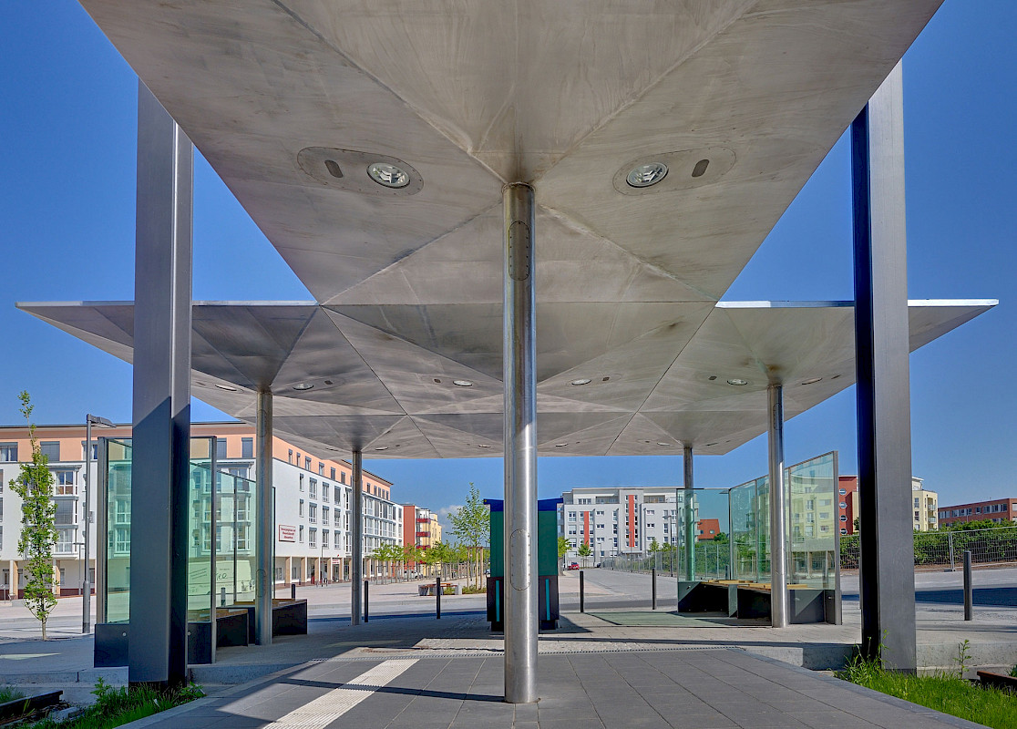 Frankfurts newest, Northernmost urban quarter is connected to the Frankfurt subway system by the newly built train line 18 „Frankfurter Bogen“. The terminal stop lies directly on one end of the urban square „Gravensteiner Platz“. The architects had to work with a very narrow platform (only 4m) on which - due to the neccessary passage widths of 2m on either side - no furnishings were possible. Consequently the waiting area with seating possibilities and weather protection is located at the end of the platform under the wide area of the roof structure. Apart from purely functional features such as protection from wind and rain, waiting areas have to have a high sense of orientation, whilst being easy to maintain and keep clean, all the time being completely vandalproof. The main interest of the architects was to create a thin, quiet and consequently elegant structure whilst maintaining all the necessary budgetary needs, functionality and robustness. 12 stainless steel roof elements consisting of upside down pyramids lie on thin stainless steel columns. All the neccessary elements such as lighting and speaker fixtures are flushly integrated into the descretely folded roof structure, emphasising the appearance of the wing of an aircraft.