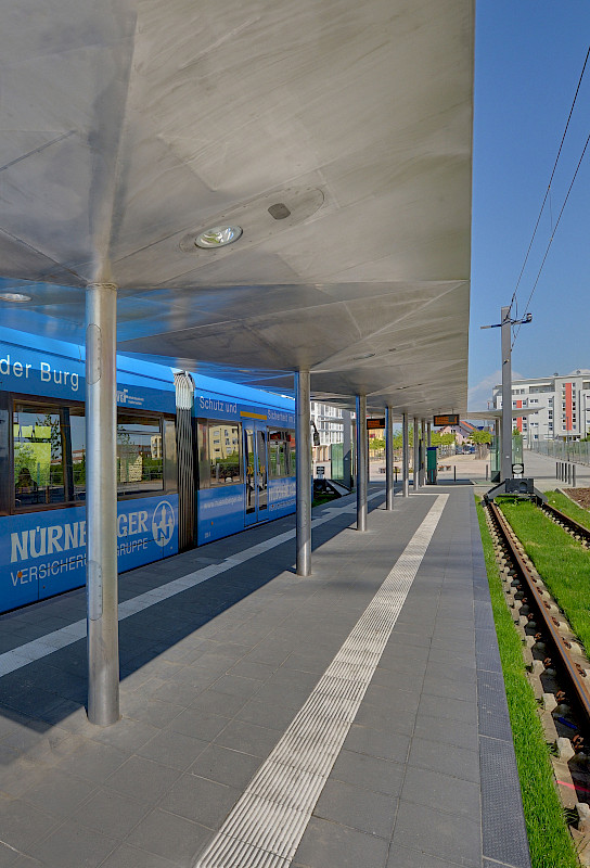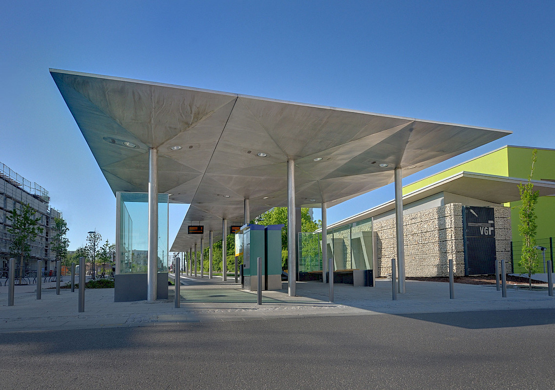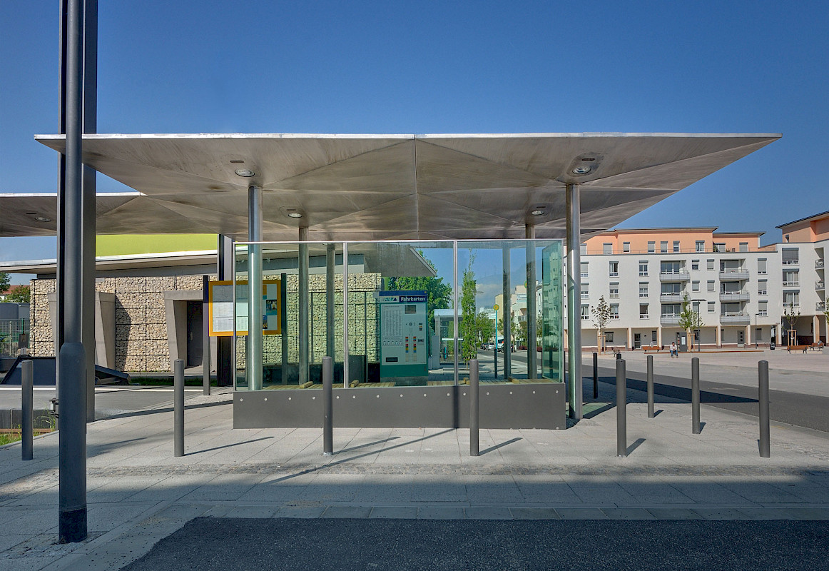 Frankfurts newest, Northernmost urban quarter is connected to the Frankfurt subway system by the newly built train line 18 „Frankfurter Bogen“. The terminal stop lies directly on one end of the urban square „Gravensteiner Platz“. The architects had to work with a very narrow platform (only 4m) on which - due to the neccessary passage widths of 2m on either side - no furnishings were possible. Consequently the waiting area with seating possibilities and weather protection is located at the end of the platform under the wide area of the roof structure. Apart from purely functional features such as protection from wind and rain, waiting areas have to have a high sense of orientation, whilst being easy to maintain and keep clean, all the time being completely vandalproof. The main interest of the architects was to create a thin, quiet and consequently elegant structure whilst maintaining all the necessary budgetary needs, functionality and robustness. 12 stainless steel roof elements consisting of upside down pyramids lie on thin stainless steel columns. All the neccessary elements such as lighting and speaker fixtures are flushly integrated into the descretely folded roof structure, emphasising the appearance of the wing of an aircraft.