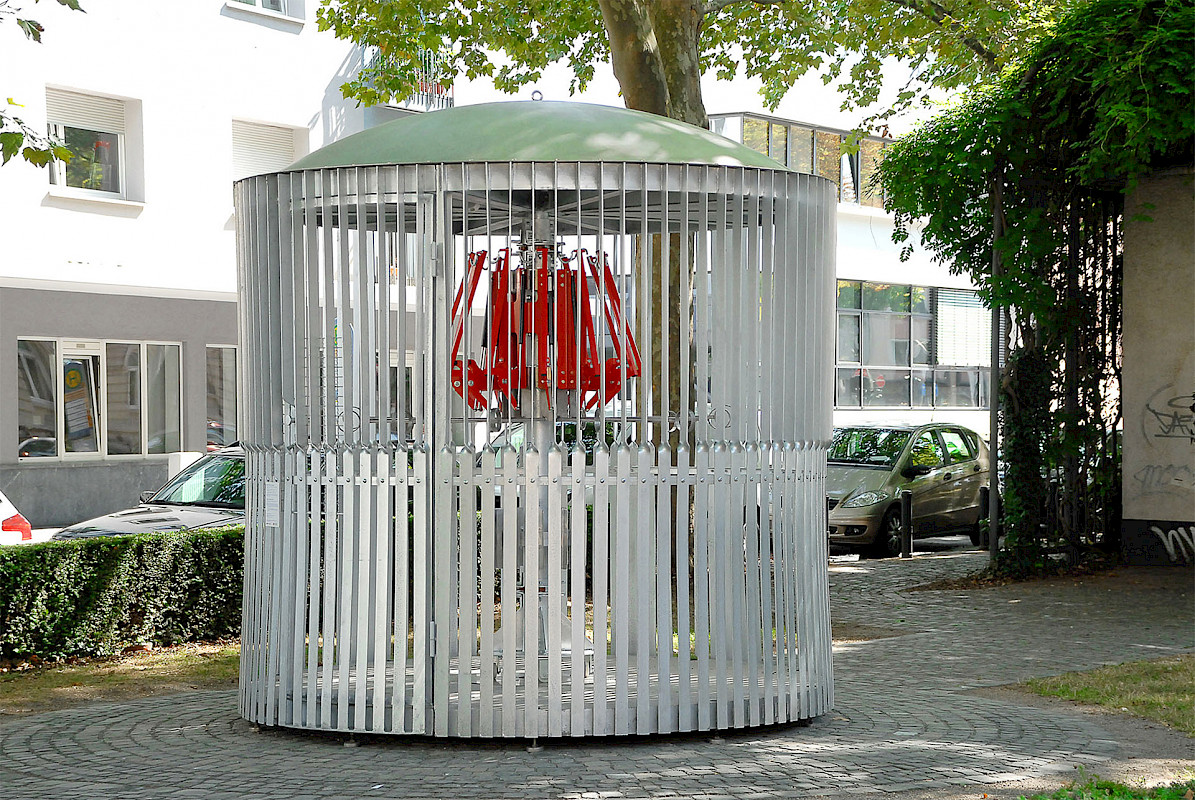 It was against this background that SYRA_SCHOYERER ARCHITEKTEN developed an initial prototype of a bike pavilion for the city of Mainz. True to the practice’s philosophy of repurposing everyday items, only industrially pre-built mass-produced products were used in the design of this bike pavilion. There are no special components, although the flat steel facade bars were each rotated 90°.