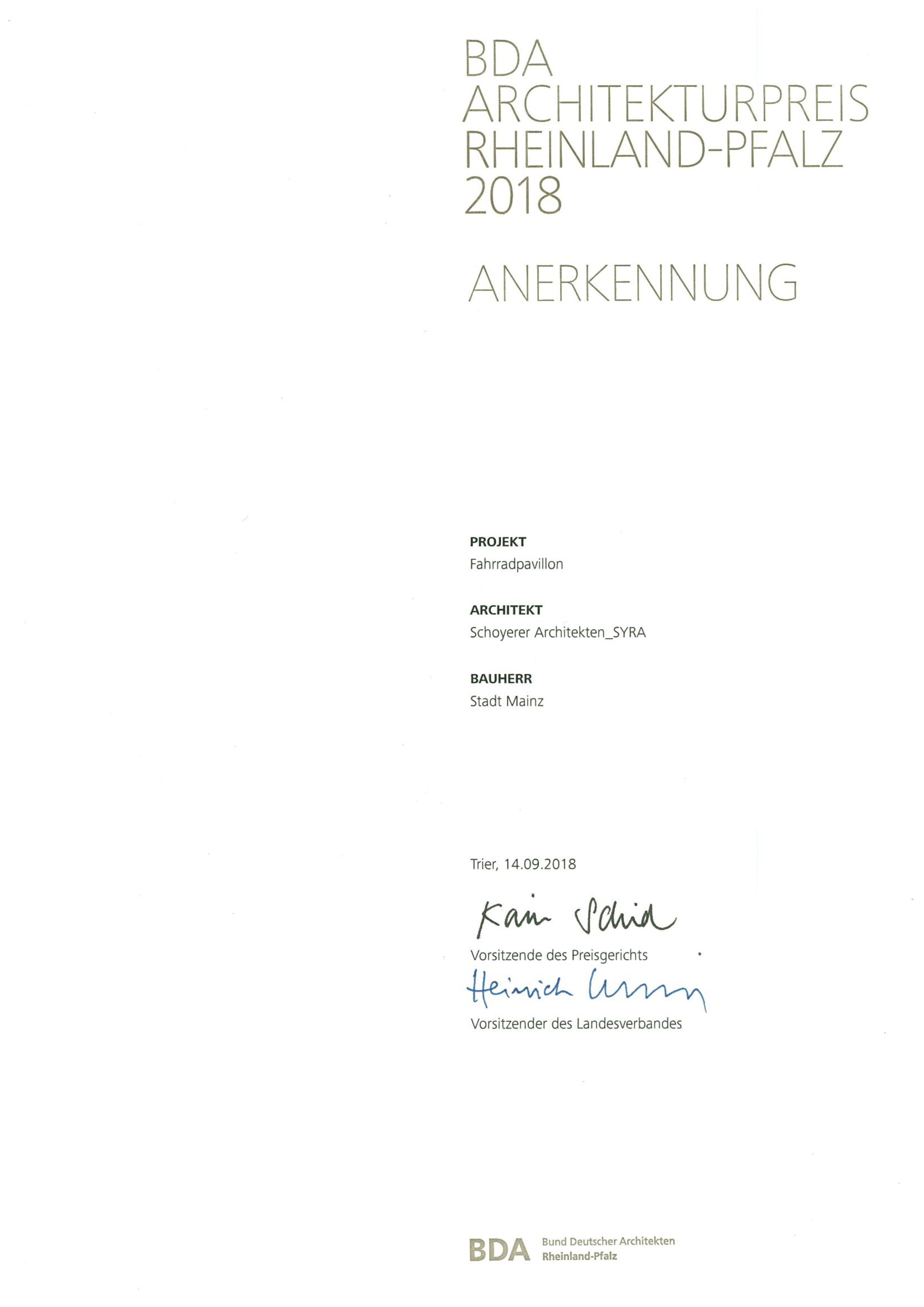 | 2018 | Preisträger BDA-Architekturpreis Rheinland-Pfalz 2018 Anerkennung | Urkunde Jurybegründung | BDA-BUND.DE |
