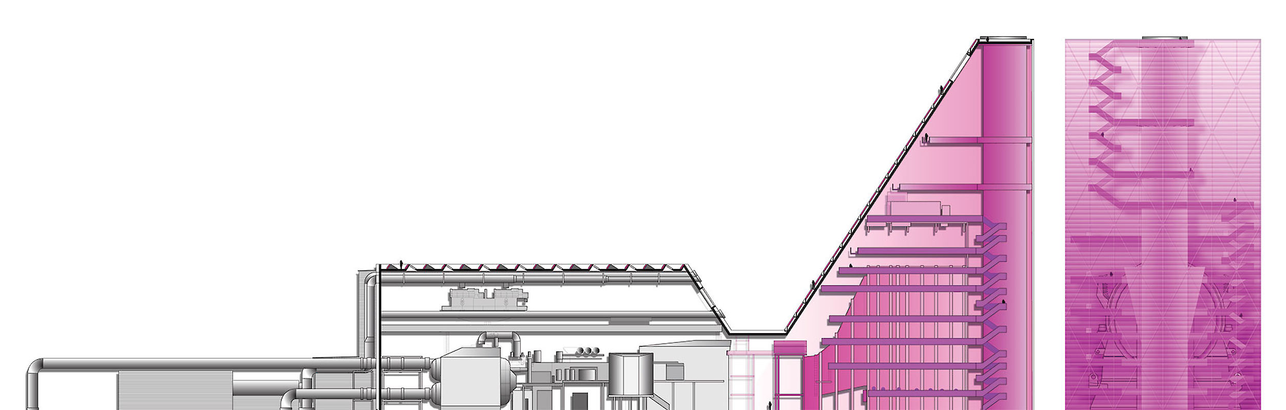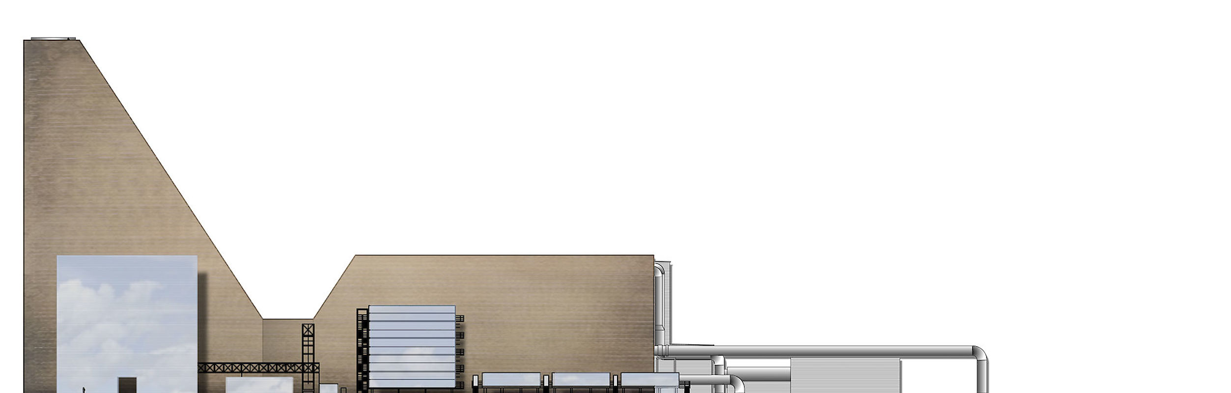 Die Gestaltungsaufgabe für das neue Kraftwerk Lausward steht im Spannungsfeld einer hochkomplexen Anlagentechnik und den hohen gestalterischen Anforderungen an ein Gebäude, das aufgrund seiner exponierten Lage zeichengebend im Stadtbild Düsseldorfs sein soll. Die bislang verfolgte Planung für das neue Kraftwerk sieht, ohne Nutzungsverweis, eine belanglose Gebäudehülle als Wetter- und Emissionsschutz vor. Nach Auffassung der Verfasser muss die Gebäudehülle mit der ausgeschriebenen Kraftwerksanlage zu einer symbiotischen Einheit werden und daher ist neben den rein technischen Funktionen vor allem eine prägnante Gebäudeform mit glaubhaften Architekturelementen von größter Bedeutung. Prinzipiell ähneln sich Gas- und Dampfturbinenkraftwerke in ihrer strukturellen Anordnung: Maschinenhaus mit Kesselhaus und dazwischenliegendem Turbinenhaus. Daher schlagen die Verfasser vor, die typische Anlagenkontur von GuD-Kraftwerken volumetrisch nachzuzeichnen, mit dem Ergebnis, eine für diese Anlagen spezifische und in höchstem Maße prägnante Gebäudekontur und daher eine weithin sichtbare und signalgebende Gebäudeform zu erhalten. Durch diese Gestaltungsstrategie kann im weiteren Planungsprozess auf anlagentechnische Änderungen und Volmenänderungen eingegangen werden und somit kann auf die komplexe Anlagentechnik und deren technische Erfordernisse in exzellenter Art und Weise, ohne Qualitätseinbußen hinsichtlich der entwurfsprägenden Gestaltungsaussage, reagiert werden.