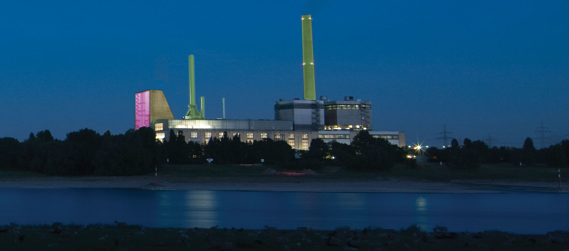 Das neue Beleuchtungskonzept für den Kraftwerkskomplex am Lausward soll die Dynamik und Präsenz des Ensembles steigern und dem Grünraum Lausdward und der Betonung der Stadtkante Rechnung tragen. Ausgehend von dem bestehenden grün angestrahlten Kraftwerksschlot, arbeitet das Lichtkonzept mit den Komplementärfarben Grün – Magenta und deren Mischfarbe Weiß. Als Gegenstück zu dem bereits grün beleuchteten Schlot wird die zur Stadt orientierte Vitrine dezent in magentafarbiges Licht getaucht. Mit zurückgenommenem weißem Licht werden die umgebenden Gebäude, als verbindende Elemente zwischen „neuer Vitrine“ und „altem Schlot“, in den Nachtstunden erlebbar gemacht.