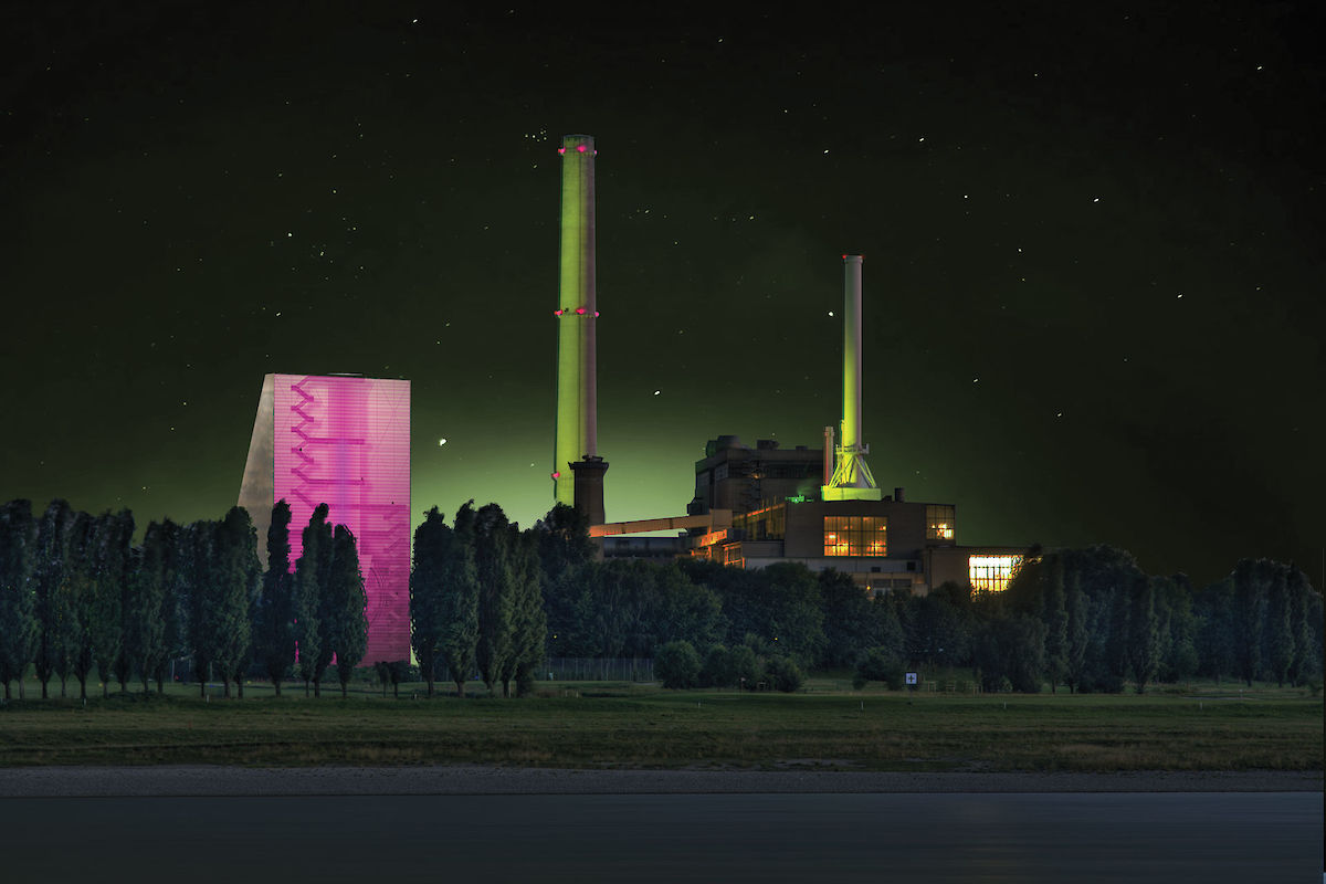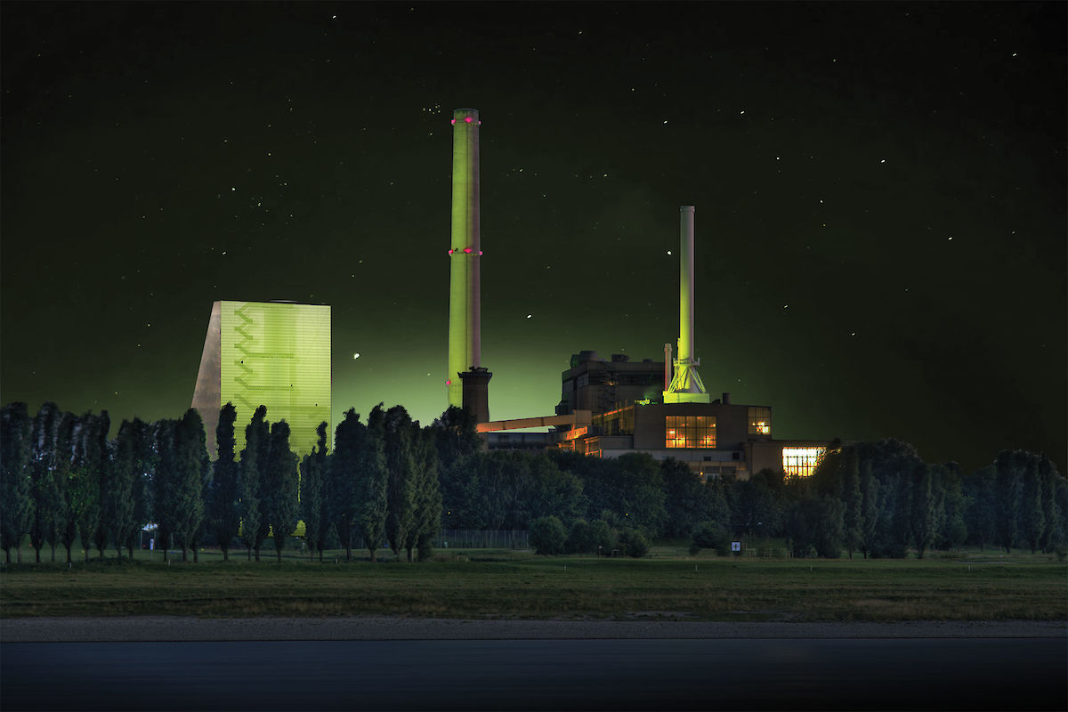 Das neue Beleuchtungskonzept für den Kraftwerkskomplex am Lausward soll die Dynamik und Präsenz des Ensembles steigern und dem Grünraum Lausdward und der Betonung der Stadtkante Rechnung tragen. Ausgehend von dem bestehenden grün angestrahlten Kraftwerksschlot, arbeitet das Lichtkonzept mit den Komplementärfarben Grün – Magenta und deren Mischfarbe Weiß. Als Gegenstück zu dem bereits grün beleuchteten Schlot wird die zur Stadt orientierte Vitrine dezent in magentafarbiges Licht getaucht. Mit zurückgenommenem weißem Licht werden die umgebenden Gebäude, als verbindende Elemente zwischen „neuer Vitrine“ und „altem Schlot“, in den Nachtstunden erlebbar gemacht.