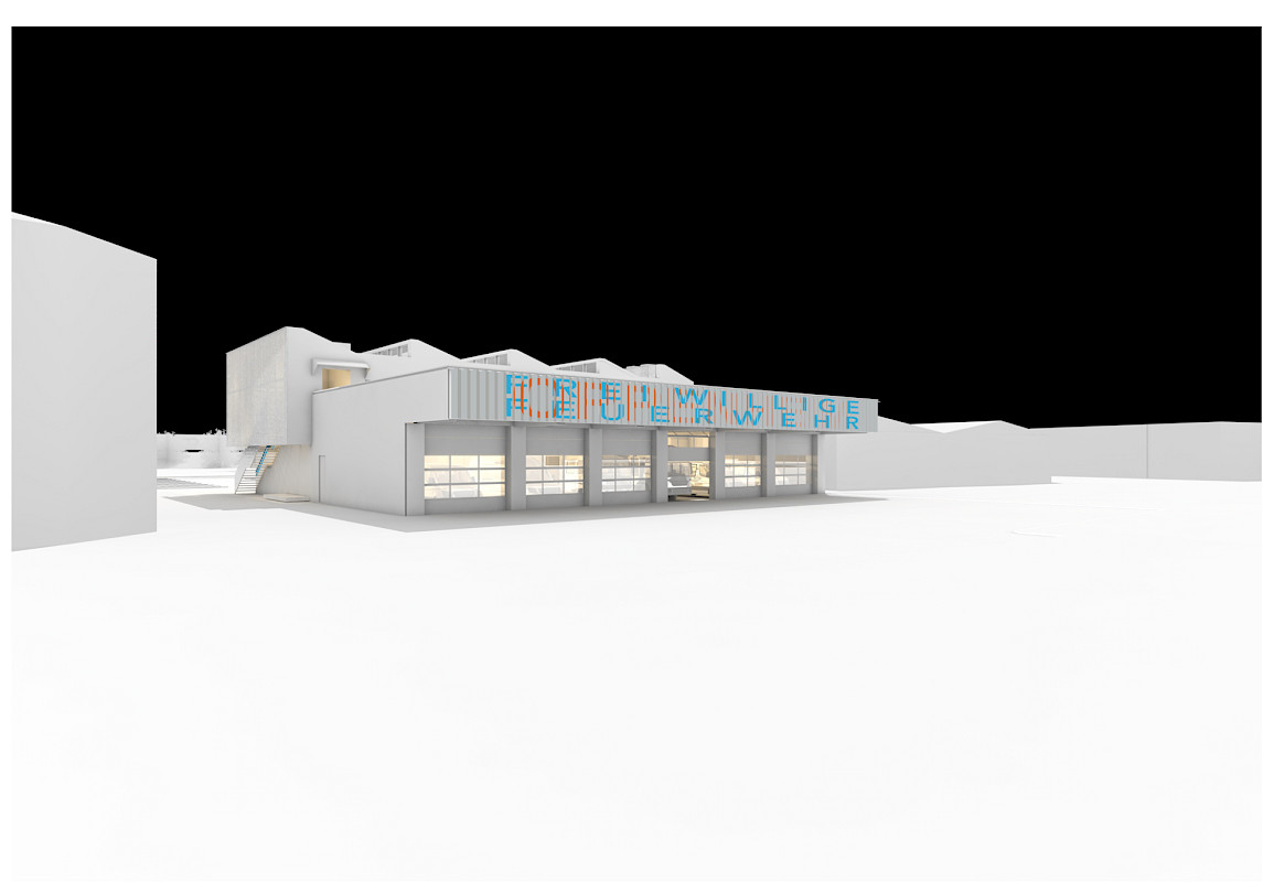 Die verschiedenen Funktionsbereiche werden in prägnante architektonische Gesten übersetzt: ein auskragendes Dach schützt die Portale der Fahrzeughalle vor Witterungseinflüssen, das rückseitig auskragende Obergeschoss bildet eine überdachte Eingangsarkade, Sheddächer sorgen für eine natürliche Belichtung der Schulungs- und Aufenthaltsräume, ein freiliegender Treppenlauf dient als zweiter Rettungsweg.