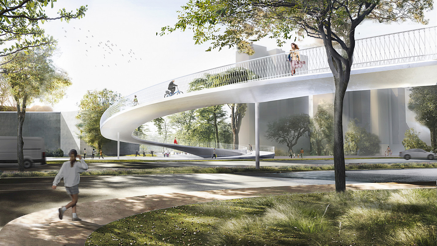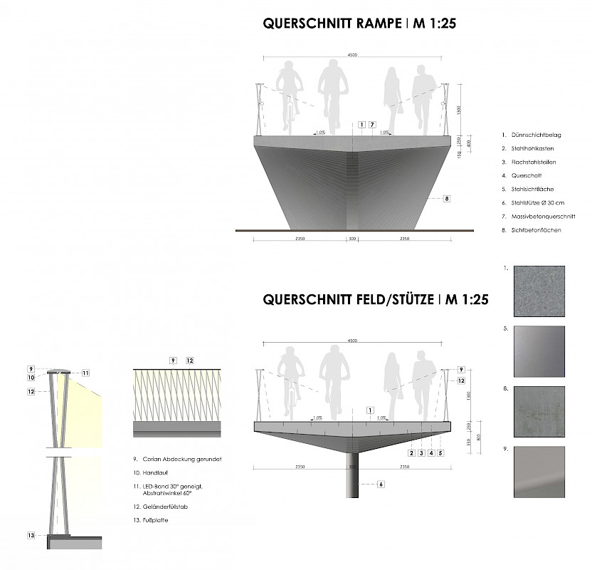Die Verfasser schlagen an dieser Stelle eine Figur vor, welche durch eine starke Drehbewegung an Höhe gewinnt und in einem weiten Bogenverlauf geradezu bildhaft die quartiersübergreifende Verbindung darstellt. Eine spindelförmige Konstruktion an dieser Stelle wird aus verschiedenen Sichtachsen als Landmark und/ oder als Stadtportal wahrgenommen, denn nicht nur im Kreuzungspunkt von Thüringer Straße und Branderburgerstraße ist diese Figur gut sichtbar, sondern auch vom Columbuspark und von der B38, bzw. dem künftigen Stadtboulevard. Nicht nur die Drehbewegung und der Brückenverlauf zeigen eine dynamische Bewegung, auch der Brückenkörper selbst verändert sich von massivem Widerlager zu filigranem Steg und umgekehrt. Je nach Geschwindigkeit und Blickwinkel erscheint die Brückenfigur für Fußgänger, Radfahrer und Autofahrer nicht als statisches Bauwerk, sondern selbst als dynamische Figur. Das Geländer mit seinen schräg gestellten Stäben verstärkt diesen Eindruck, denn je nach Blickwinkel erwecken die Brückenbrüstungen Eindrücke von transparenten oder geschlossenen Texturen.