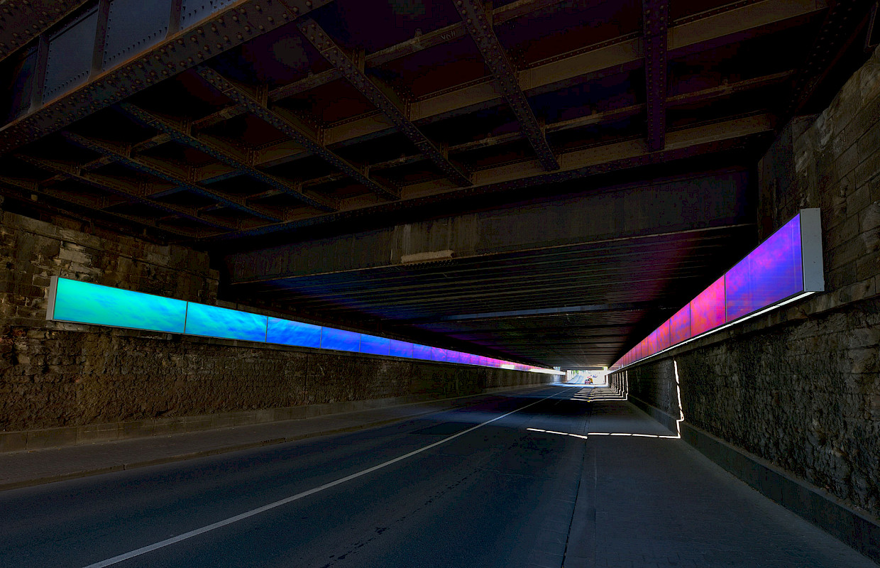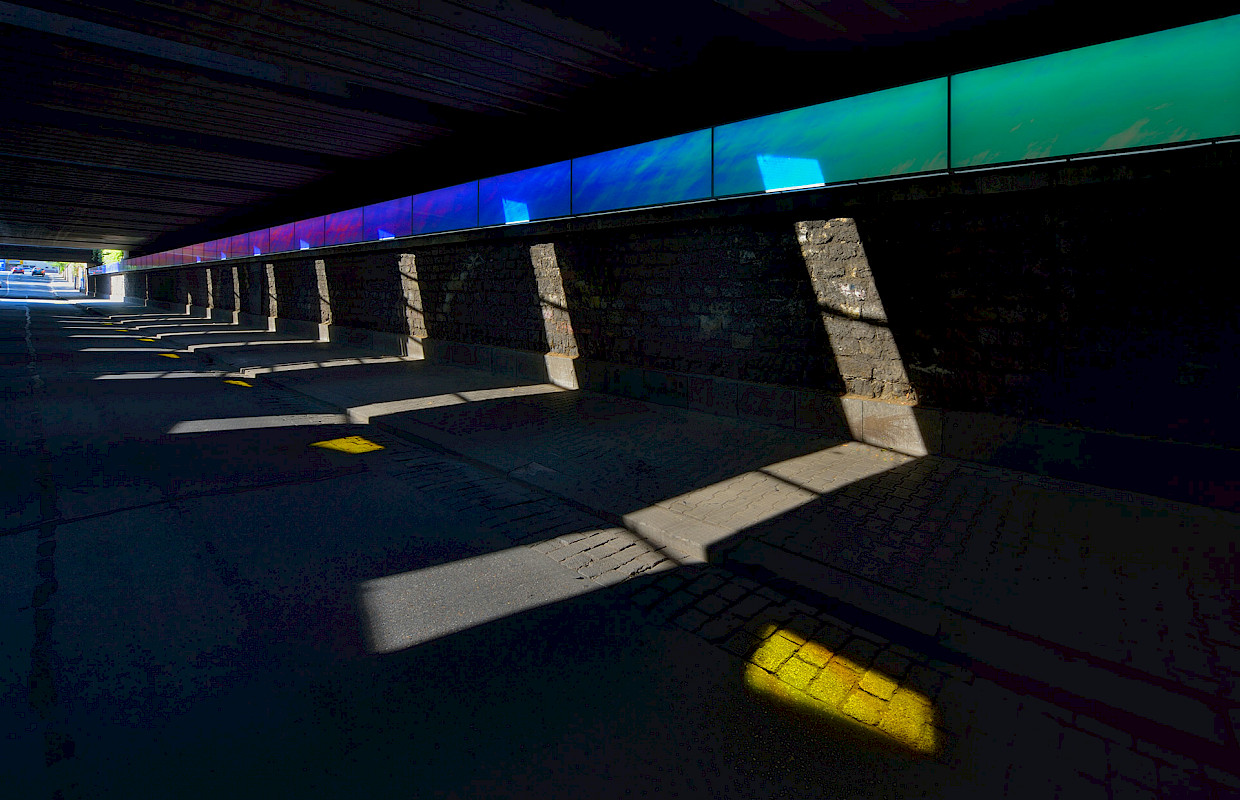 Consequently SYRA_SCHOYERER ARCHITEKTEN decided to combine the parameters of light, colour and design into a single flat box that runs the length of the tunnel. Hereby the architects utilized industrial mass produced parts that until lately were not commonly available, such as LED lights and modern foil technology. The LEDs keep the power consumption low whilst allowing for the necessary lighting. The foil creates an ever changing colour spectrum featuring all colours of the rainbow. Whilst the observer moves through the tunnel the colours constantly shift, creating an interactive experience.