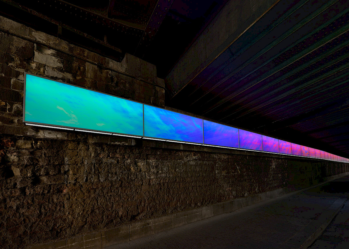 Die Tunnelwände bleiben in ihrer Oberfläche und Struktur vollkommen unverändert. Deren 130 Jahre alter archaischer Charakter bildet einen interessanten Kontrast zu dem modernen Farb- und Lichtspiel.