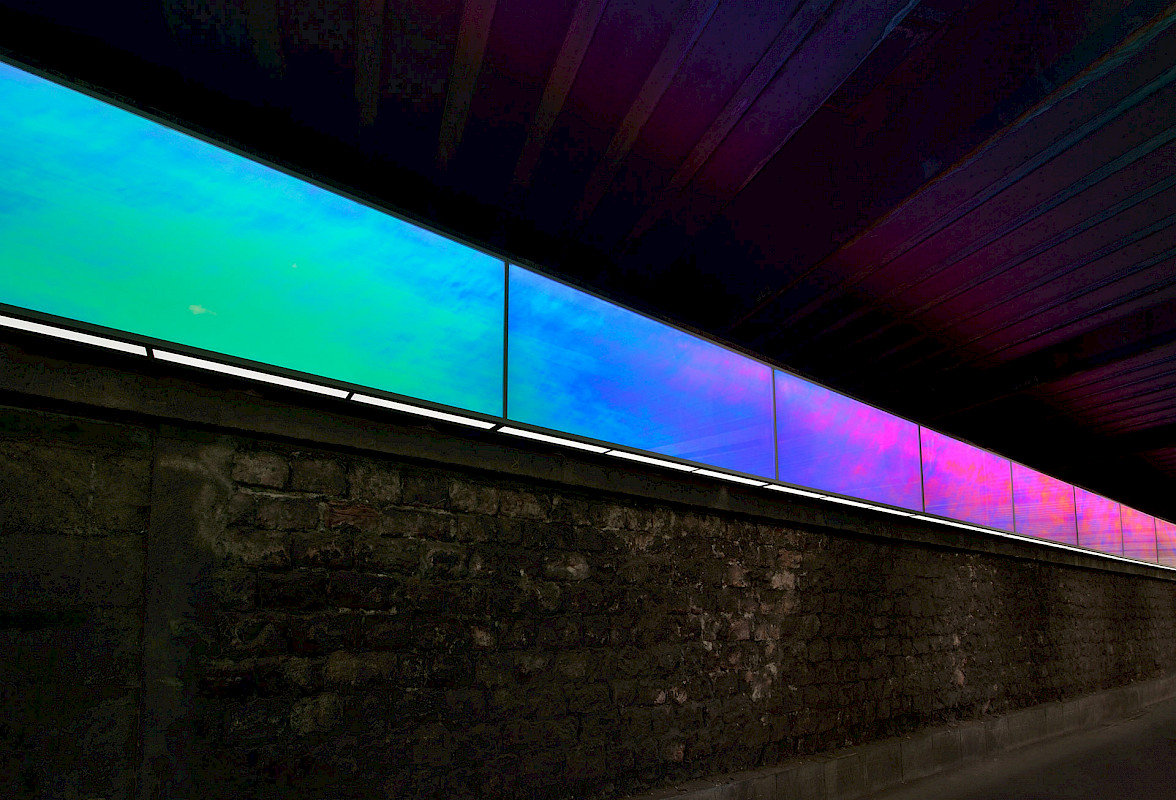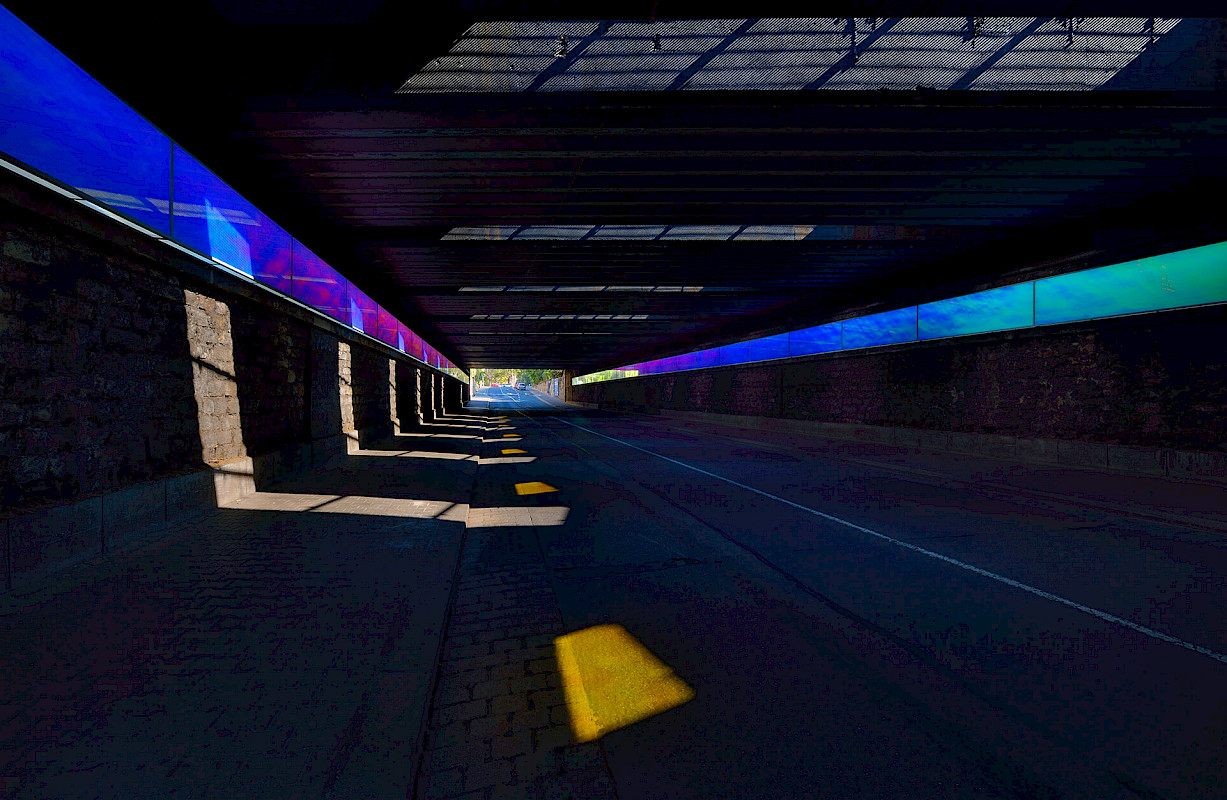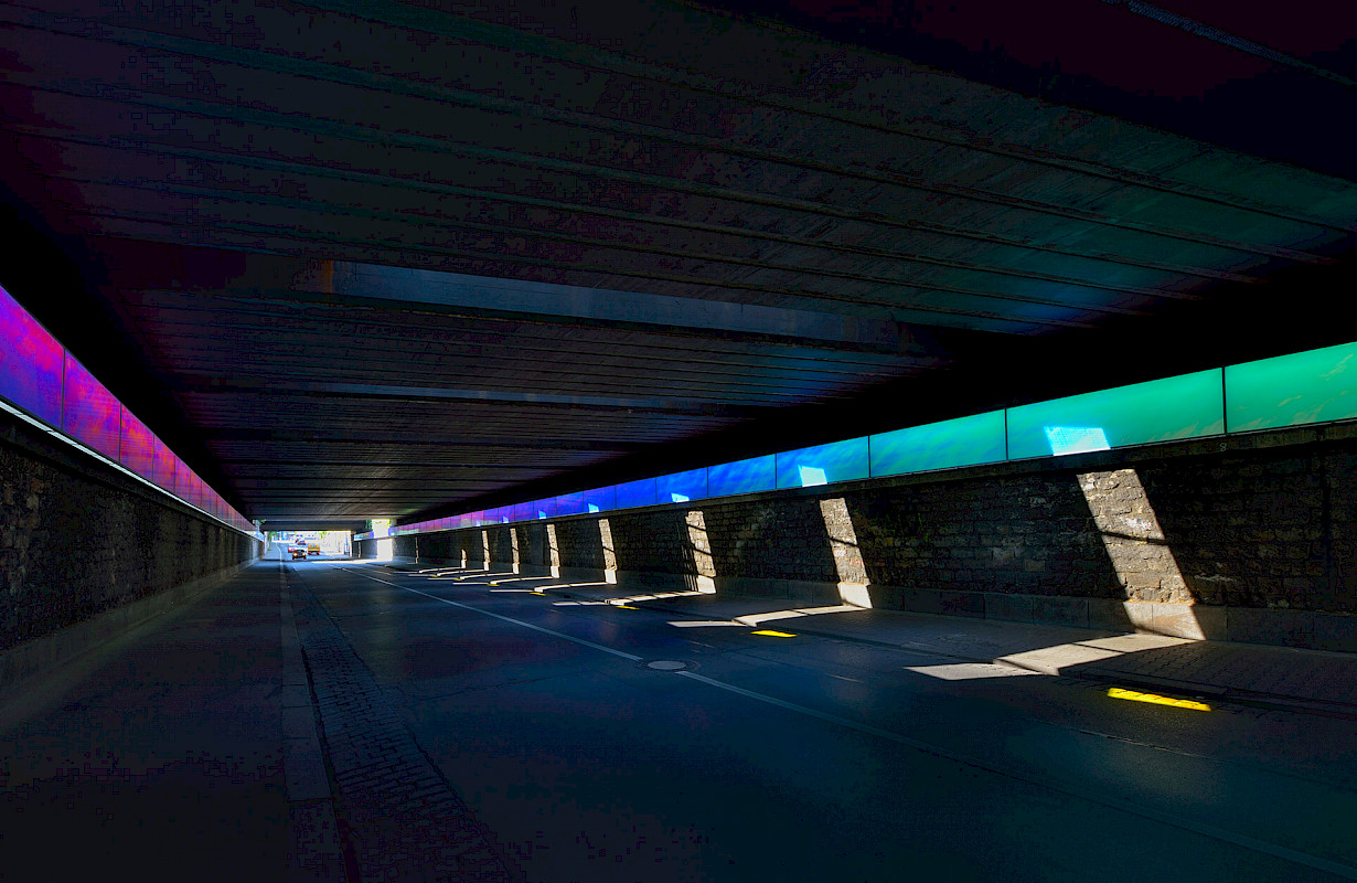 Consequently SYRA_SCHOYERER ARCHITEKTEN decided to combine the parameters of light, colour and design into a single flat box that runs the length of the tunnel. Hereby the architects utilized industrial mass produced parts that until lately were not commonly available, such as LED lights and modern foil technology. The LEDs keep the power consumption low whilst allowing for the necessary lighting. The foil creates an ever changing colour spectrum featuring all colours of the rainbow. Whilst the observer moves through the tunnel the colours constantly shift, creating an interactive experience.