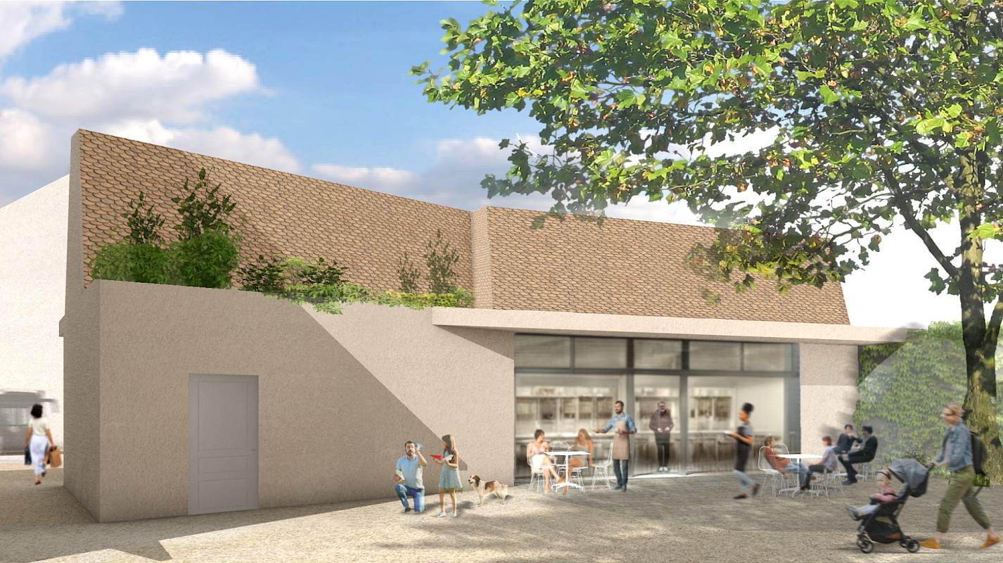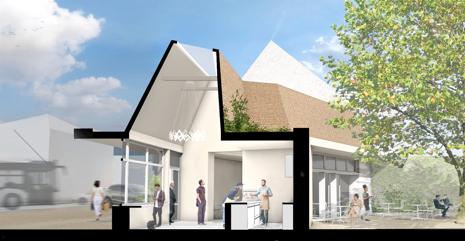 Im Süden wird zusätzlich zum Dorfladen die örtliche Infrastruktur durch einen Multifunktionsbereich ergänzt, welcher als „Heiße Theke“ den Passanten an der Neustraße ein Angebot bietet. Auch an der südlichen Grundstücksgrenze werden Parkplätze für Kunden und Bewohner vorgesehen. Richtung Norden erstreckt sich der Dorfladenhof mit Sitzmöglichkeiten unter dem Bestandsbaum.