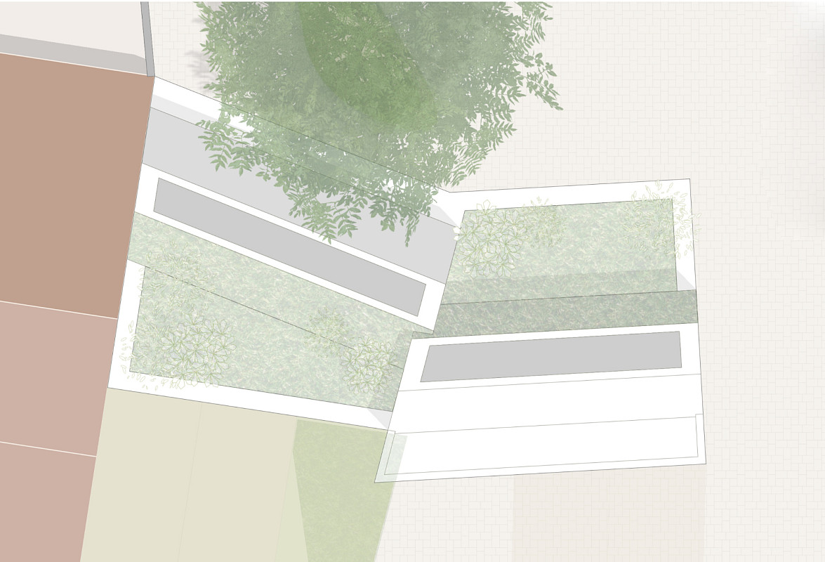 - Im Süden – entlang der Neustraße – wird das Thema mit den Gartenflächen, bis an die westliche Brandwand, weitergeführt.