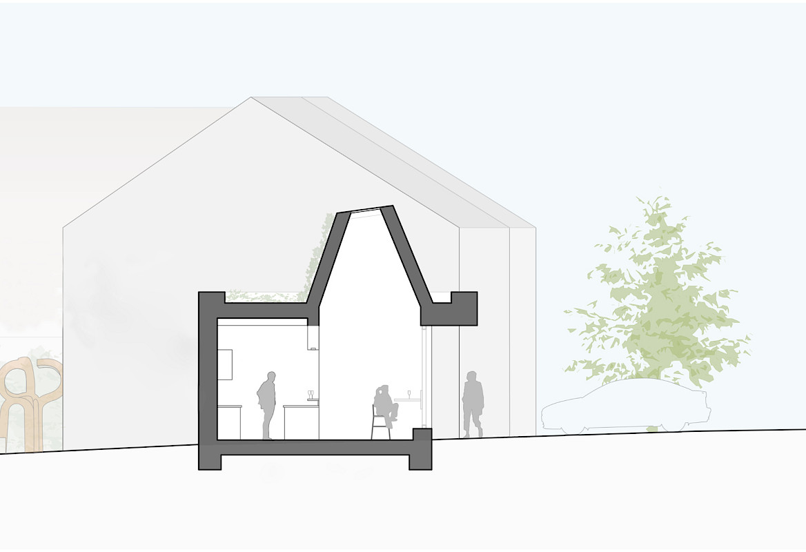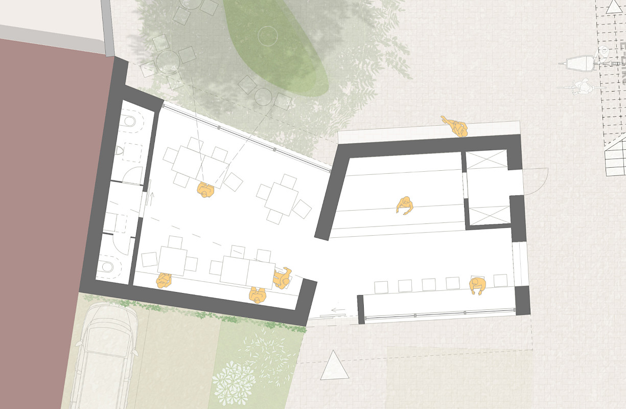 Das nördliche Bestandsgebäude in Richtung Marktplatz wird als erhaltenswert angesehen. Hier werden im Erdgeschoss die Vereinsräume vorgeschlagen und im OG die Sprechzimmer für das Rathaus und 4 Co-Working Spaces. Parallel zum Dorfladen erstreckt sich entlang der Verstanstaltungshofs das Reparaturcafé, bzw. die Atelier-Werkstatt sowie der barrierefreie Zugang zu allen Nutzungen im OG des Ideenteils. Richtung Neustraße wird ein Neubau vorgeschlagen, welcher nach Süden in die Achse der östlich angrenzenden Bestandsgebäude rückt und nördlich einen kleinen Kunsthof schafft. In diesem Riegel wird im EG der Veranstaltungsraum und im OG der Jugendraum, die Hausmeisterwohnung und eine weitere (Miet-)Wohnung angeordnet. Sämtliche Räume im Ideenteil sind auf beiden Ebenen barrierefrei erreichbar.