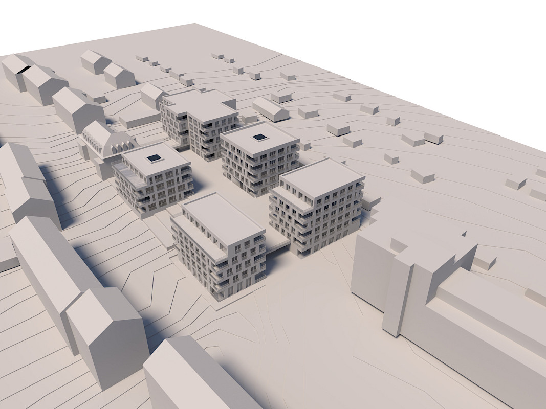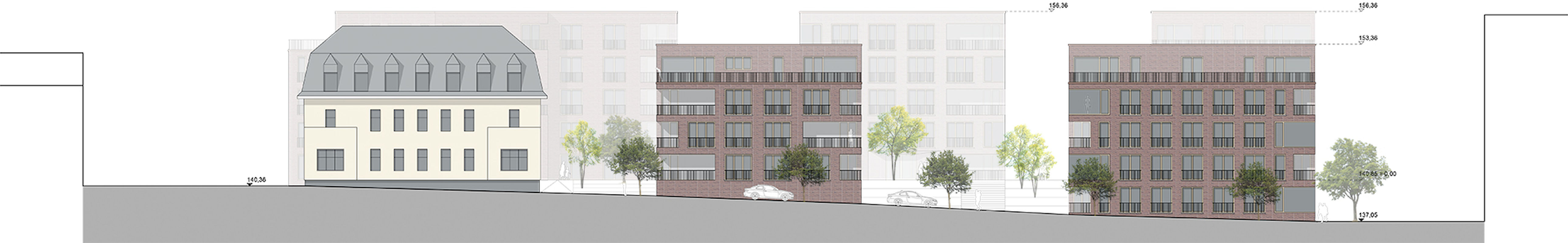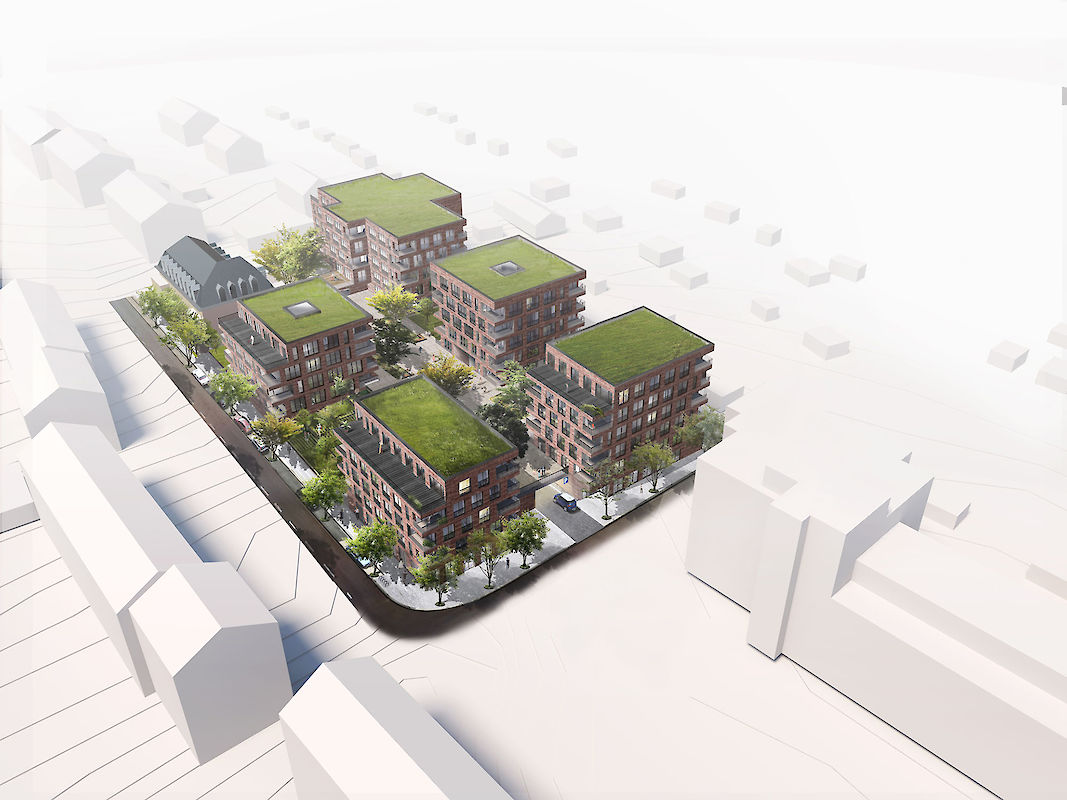 Die Geschossigkeit variiert von IV bis VI, teilweise mit Staffelgeschossen. Die Grundrisse sind so ausgebildet, dass eine Mischung aus freifinanzierten Wohnungen und Sozialwohnungen möglich ist. Sämtliche Fassaden werden in einem hellen rotbraunen Klinker verkleidet.