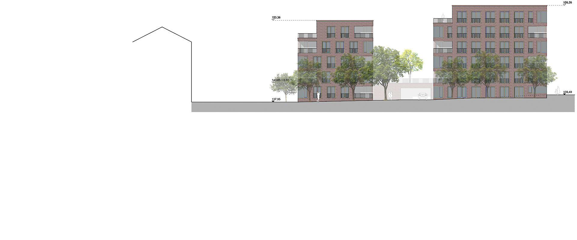 Das Wohnungsbau-Ensemble aus zwei würfelartigen Solitären und zwei Langhäusern wird am Schliemannweg über eine Kombination von Treppenanlage und Rampe erreichbar sein. Auf Straßenniveau bieten sich weitere Wohnflächen an oder aber auch publikumsorientierte Nutzungen wie Praxen oder kleine Geschäftseinrichtungen.