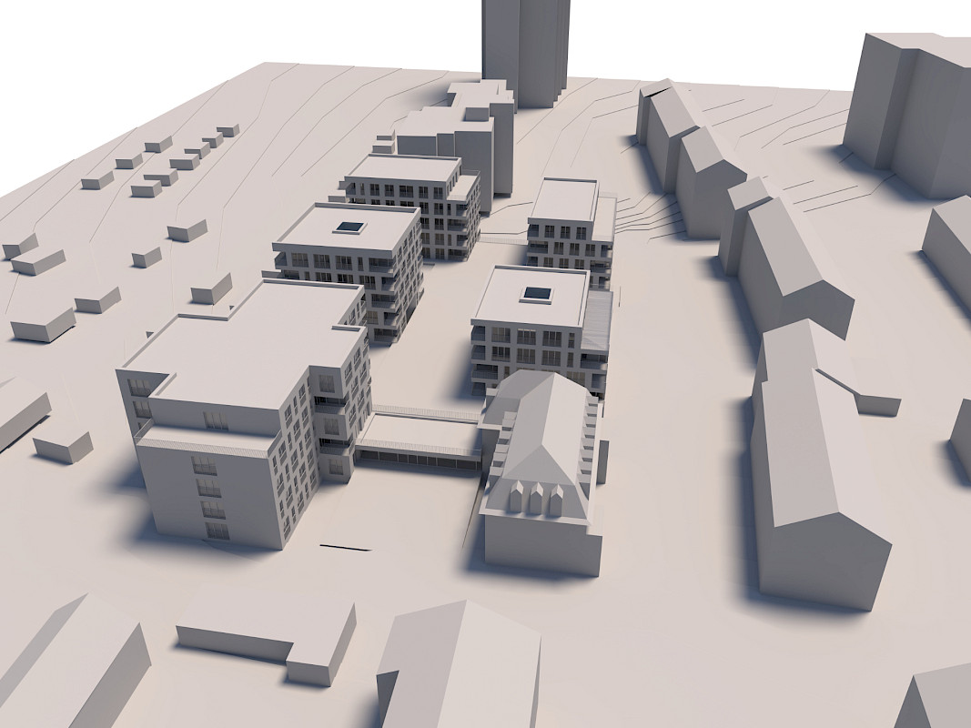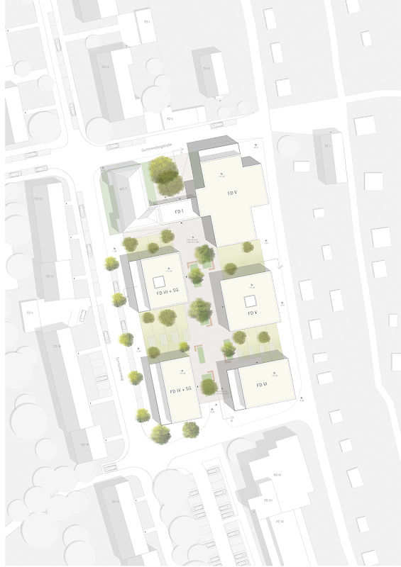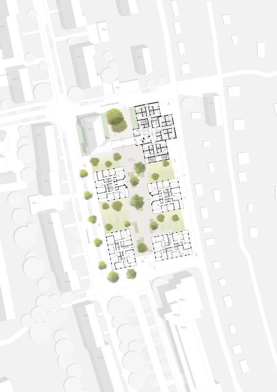 Analog der umgebenden Bebauung mit jeweils begrünten Hofflächen wird zwischen den Solitären ein intensiv begrünter multifunktionaler und halbprivater „Wohncampus“ geschaffen, welcher durch seine gestaffelte Höhenlage gegenüber dem angrenzenden Stadtraum seine Intimität und Ruhe behalten kann. Gezielte Baumstellungen lassen unterschiedliche multifunktionale Räume (Kinderspielplatz, Gemeinschaftsbereiche und Ruhezonen, evtl. Mietergärten) mit hoher Aufenthaltsqualität entstehen. Kleine Quartiersplätzchen mit Spielangebot, großzügige Baumscheiben mit Stauden und Gräsern und Baumstandorte sind in Form von Trögen mit Sitzauflagen ausgebildet. Die Zu- und Abluft sowie Belichtungsschlitze für das Parkdeck sind mit den Baumtrögen zu einem gemeinsamen Element konzipiert. In Anlehnung an die hellen rotbraunen Klinkerfassaden werden auch die Beläge der Hofflächen in diesem warmen Grundton mit Klinkerflächen versehen, welche zu den Rändern gänzlich in Rasen bzw. Schotterrasen auslaufen. In stärker frequentieren Bereichen, z.B. Plätzen, werden Ortbetonflächen mit Besenstrich oder Stelconplatten vorgeschlagen.