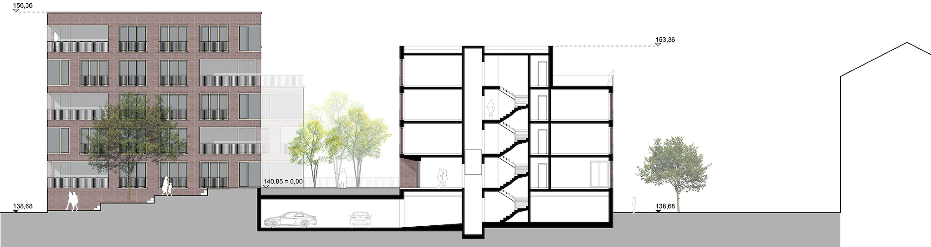 Dieser Bestandsbau hat ein Hochparterre und exakt diese Höhe wird als neues Eingangsniveau des gesamten Ensembles vorgeschlagen, d.h. alle bewohnbaren Geschosse bauen darauf auf und unterhalb dieses Eingangsplateaus wird ein Parkdeck für ca. 44 PKWs mit Zu- und Ausfahrt an der südlichen Stirnseite vorgeschlagen, zumal die Topographie dies schon direkt anbietet, denn das Gelände fällt entlang der in Bezug auf das Hochparterre des Bestandsbaus um knappe vier Meter ab. Durch die komplett höhengleiche Oberflächengestaltung des Eingangsplateaus ist in allen Erdgeschossbereichen (Seniorenheim, Gartenanlagen und Wohngebäude) eine barrierefreie Erschließung sichergestellt und den Senioren sind eingeladen den begrünten „Wohncampus“ mit zu nutzen.