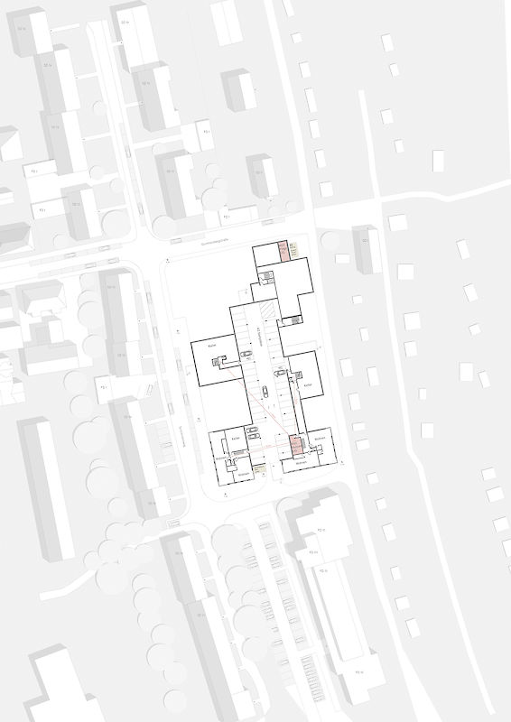 Die Verfasser bieten somit auf dem mit dem Niveau des Bestandsgebäudes höhengleichen Plateau ein Ensemble aus insgesamt (inkl. dem Altbau) sechs Solitären an. Das Seniorenheim, bestehend aus dem o.g. Bestandsgebäude und dem östlich angelagerten kreuzförmigen Neubau des Seniorenwohnhauses, wird an der Gummersbergerstraße 24 über eine breite Rampenanlage (Neigung unter 4%) erschlossen.