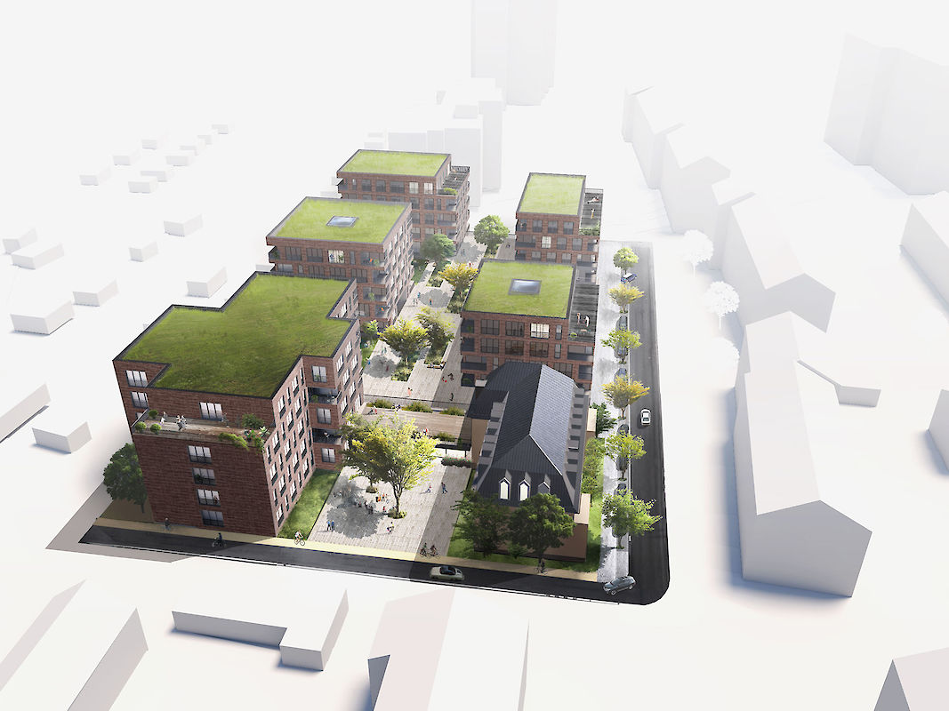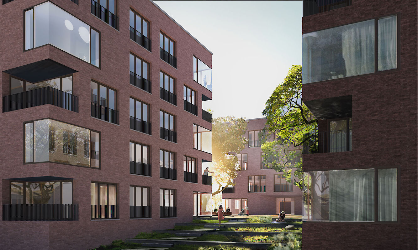 Die Geschossigkeit variiert von IV bis VI, teilweise mit Staffelgeschossen. Die Grundrisse sind so ausgebildet, dass eine Mischung aus freifinanzierten Wohnungen und Sozialwohnungen möglich ist. Sämtliche Fassaden werden in einem hellen rotbraunen Klinker verkleidet.