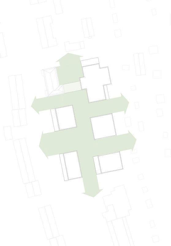 Die Verfasser bieten somit auf dem mit dem Niveau des Bestandsgebäudes höhengleichen Plateau ein Ensemble aus insgesamt (inkl. dem Altbau) sechs Solitären an. Das Seniorenheim, bestehend aus dem o.g. Bestandsgebäude und dem östlich angelagerten kreuzförmigen Neubau des Seniorenwohnhauses, wird an der Gummersbergerstraße 24 über eine breite Rampenanlage (Neigung unter 4%) erschlossen.