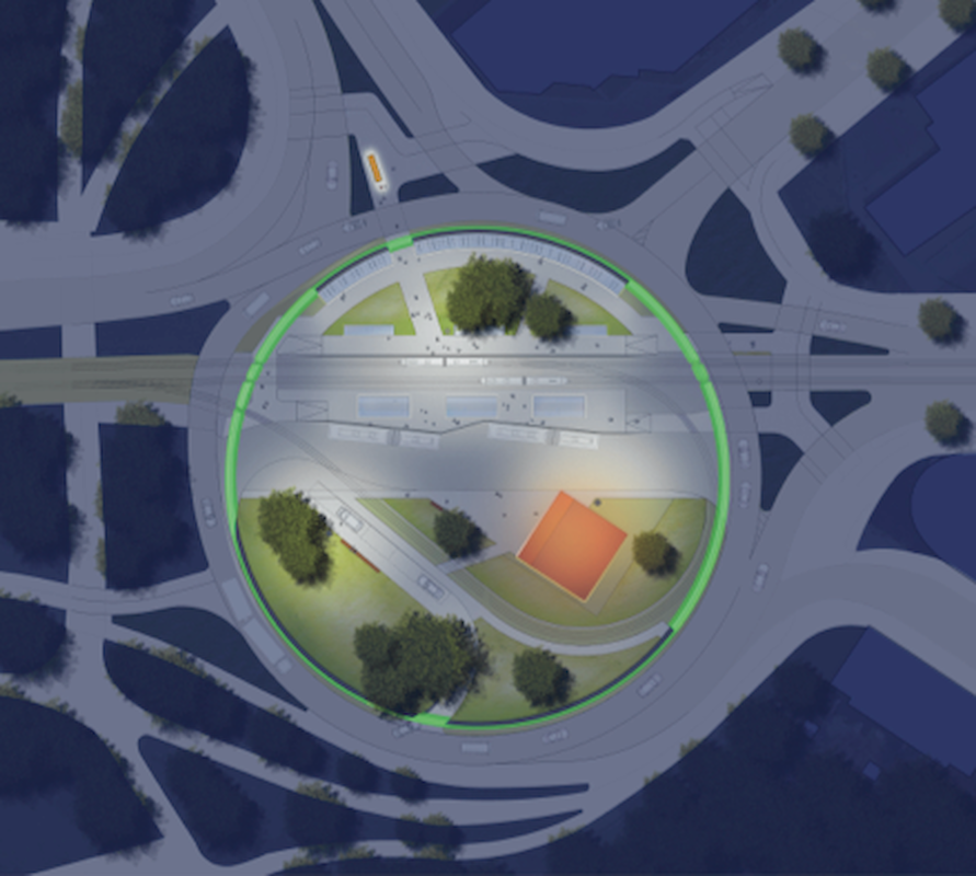 Die Metapher hin zur ursprünglichen. idealisierten Landschaft als Reminiszenz, wird durch die Einfassung des Kreisels nach außen durch einen "schwebenden Rahmen" besonders hervorgehoben. Mit Beginn der Dämmerung wird dieser Effekt durch ein im Belag integriertes Lichtband, welches den gesamten Kreisel umschließt, zusätzlich inszeniert.