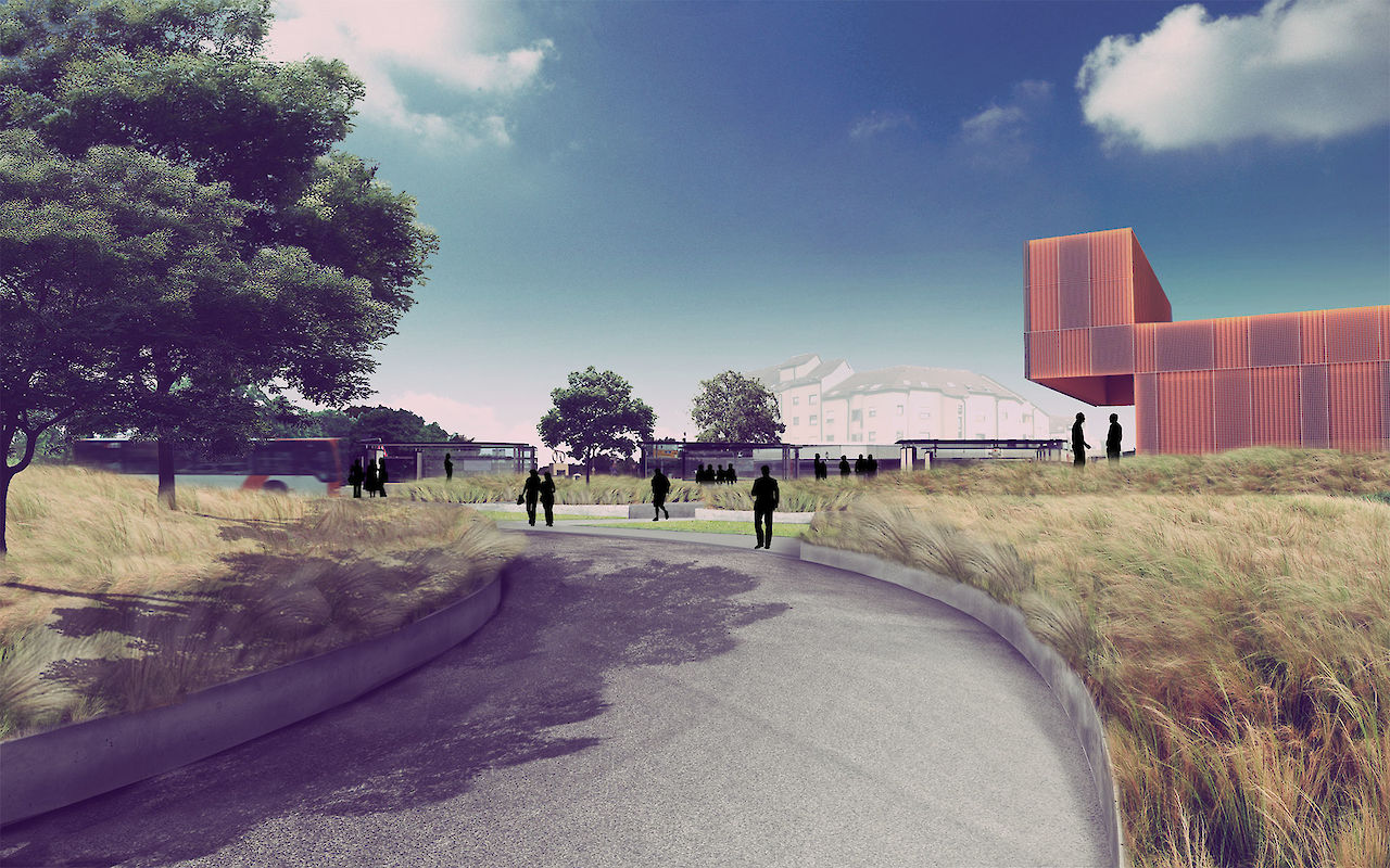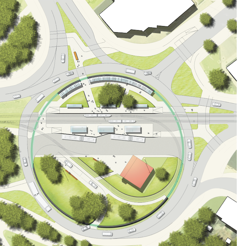 Der Gebäudebestand Gleichrichterwerk/Trafogebäude wird gemäß Raumprogramm mit dem Schaffner-Aufenthaltsraum mit WCs und einem öffentlichen WC erweitert. Das Walmdach wird abgetragen und die Gesamtkubatur wird mit einer neuen Attika architektonisch zusammengefasst. Diese Attika wird in Anlehnung an die Wartehallen von Netzwerkarchitekten über dem vorgelagerten Zugangsbereich kubisch erhöht, so dass dieser Vorbereich für die Nutzer eine innenräumliche Wirkung erhält. Darüber hinaus bildet diese Dachüberhöhung auch stadträumlich eine prägnante Figur.
