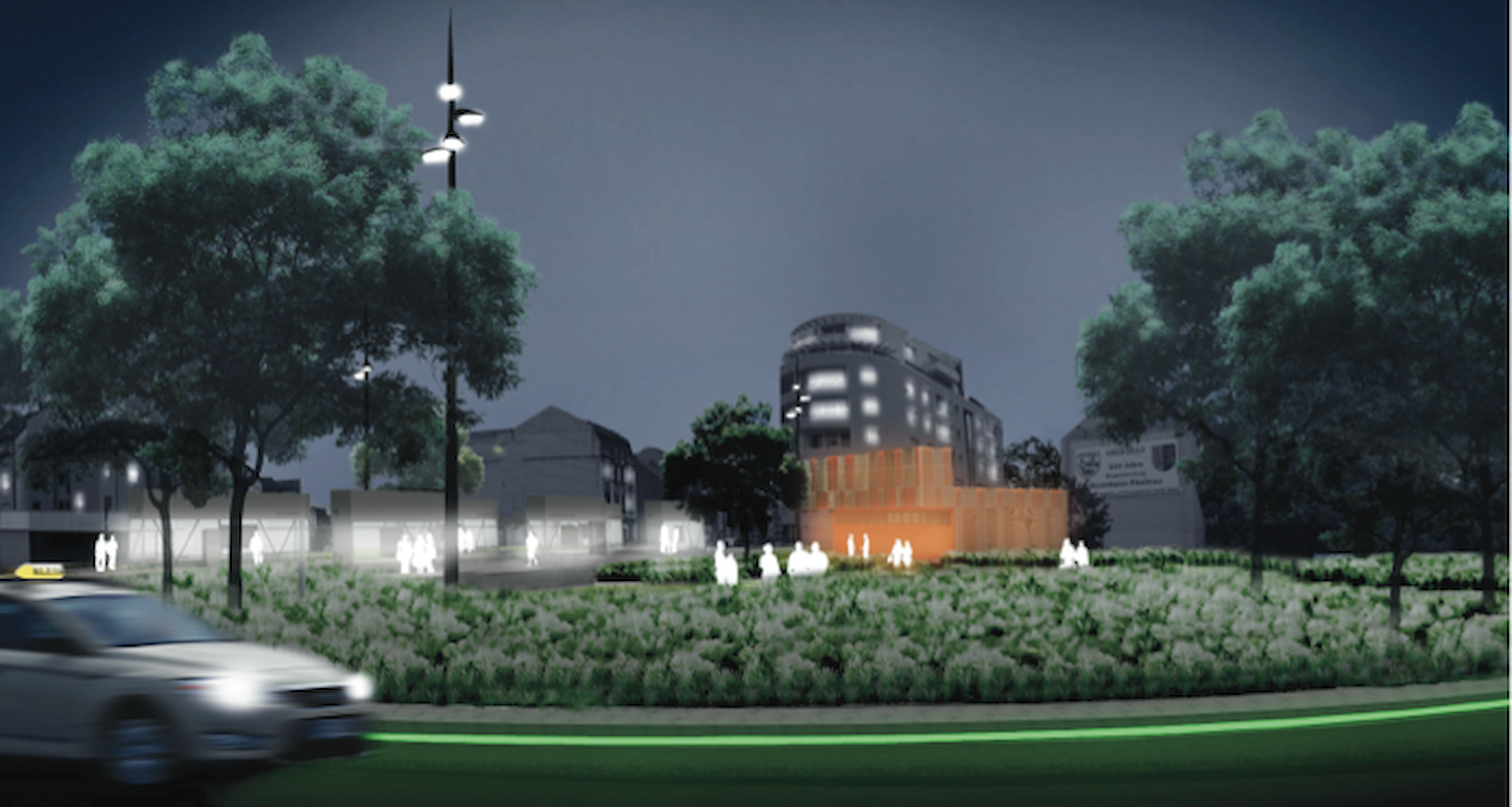 Die Metapher hin zur ursprünglichen. idealisierten Landschaft als Reminiszenz, wird durch die Einfassung des Kreisels nach außen durch einen "schwebenden Rahmen" besonders hervorgehoben. Mit Beginn der Dämmerung wird dieser Effekt durch ein im Belag integriertes Lichtband, welches den gesamten Kreisel umschließt, zusätzlich inszeniert.