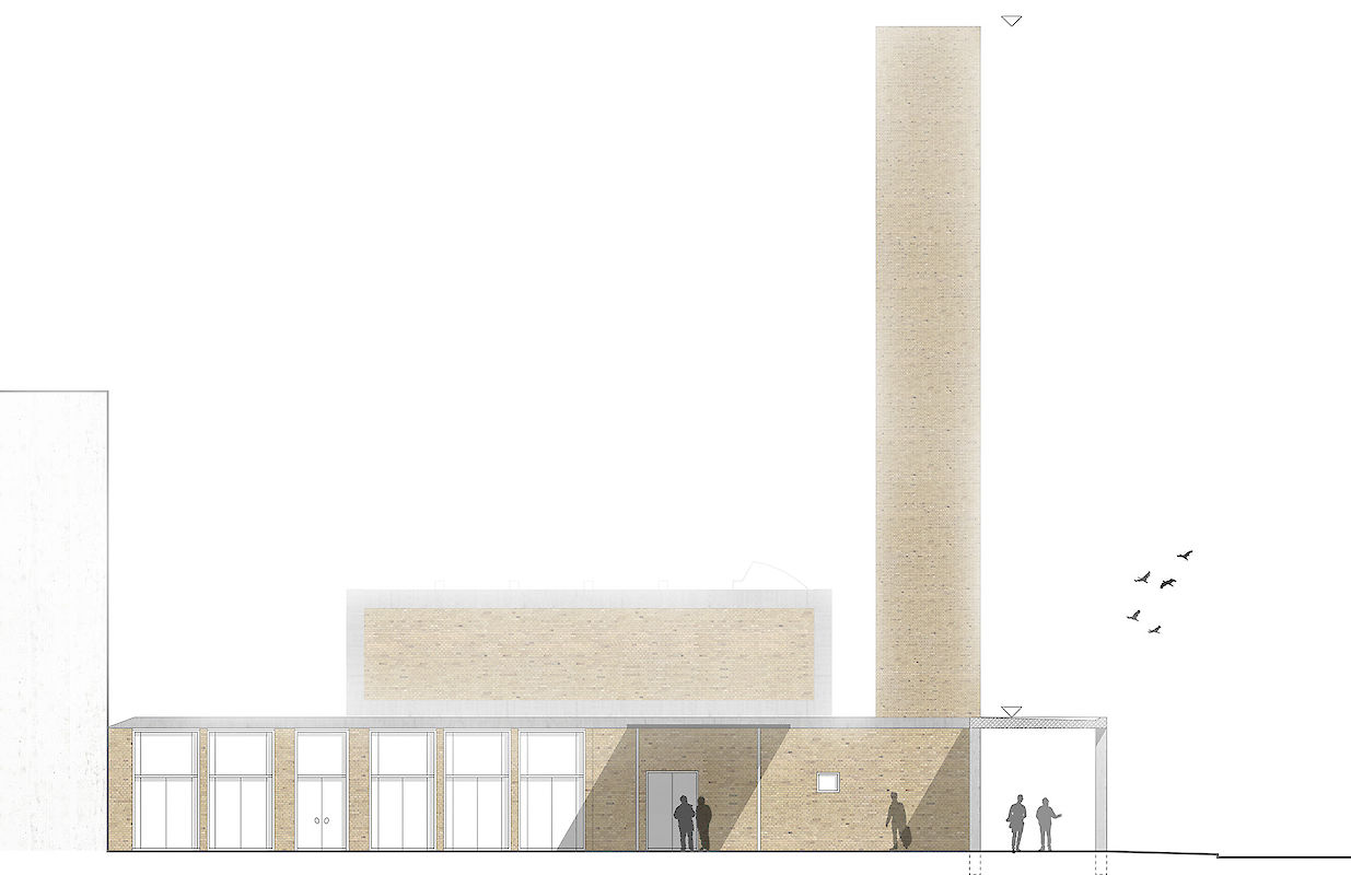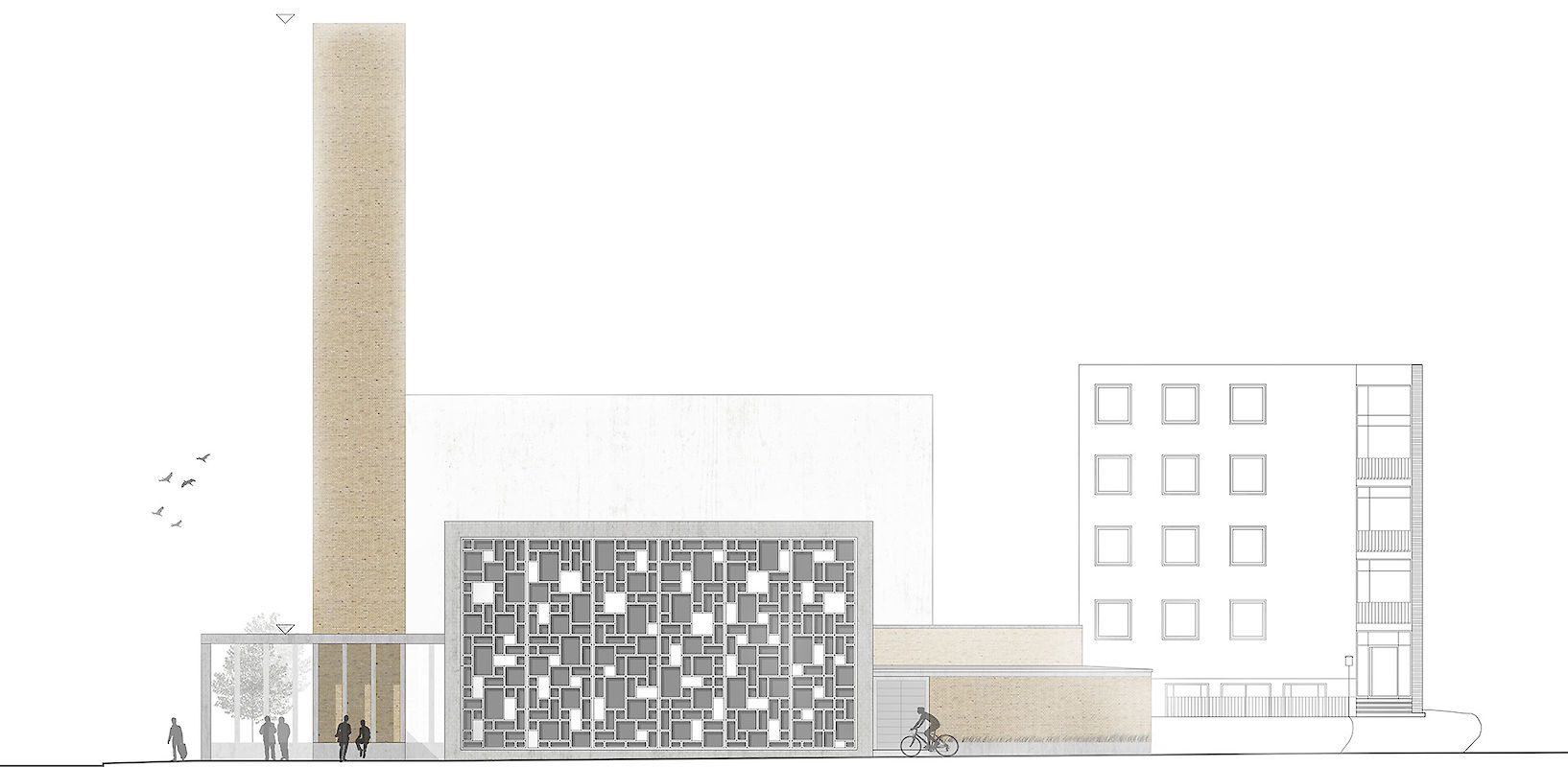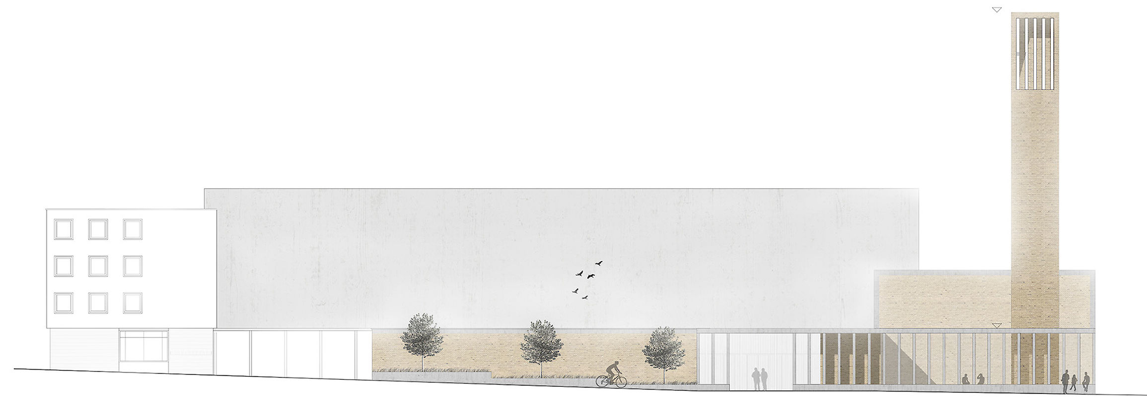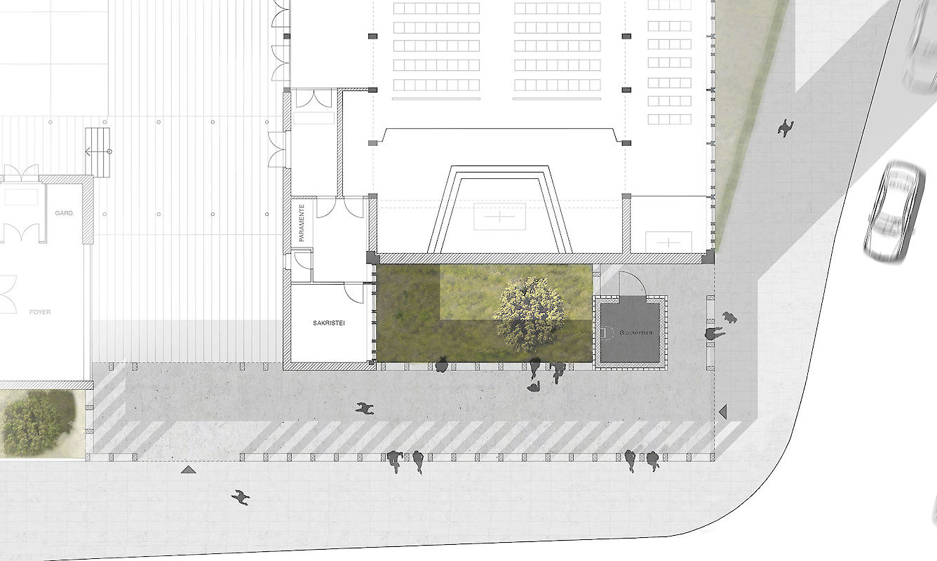 Der quadratische Grundriss des Kirchturms hat die Außenmaße von 3.49 m auf 3.49 m. Die neue Höhe von knapp 27.70 m wird durch das Aufeinanderstapeln von ca. 3 m hohen Beton- fertigteilschachtelementen erreicht, die im Werk bereits mit dem vorhandenen Klinker im Stil der Bestandsgebäude verkleidet wurden. Die Glockenstube auf 19.65 m Höhe besitzt zwei Schallfenster in Nord-Süd-Richtung. Das be- stehende Rahmen-Motiv wird in den Schallfenstern aufgegriffen. Sie bilden den Rahmen für die geneigten Pfosten, zwischen denen Schalllamellen montiert werden, die für eine optimale Schall- lenkung und -dämpfung sorgen. Der Abstand der Lamellen ist so zu wählen, dass das Eindringen und Nisten von Tauben verhindert wird. Der Innenraum der Glockenstube wird für eine optimale Schallvermischung in seiner rohen Mate- rialität aus Beton und Ziegelsteinbelassen. Neben der Leiteröffnung im Boden der Glockenstube ist eine weitere verschließbare Wartungsöffnung direkt unter den Glocken vorgesehen, durch die diese hinaufgezogen oder herabgelassen werden können.