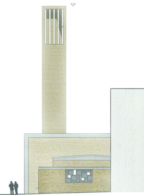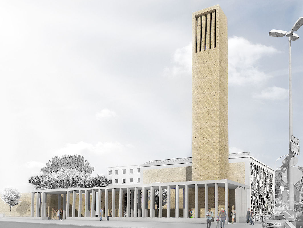 Der quadratische Grundriss des Kirchturms hat die Außenmaße von 3.49 m auf 3.49 m. Die neue Höhe von knapp 27.70 m wird durch das Aufeinanderstapeln von ca. 3 m hohen Beton- fertigteilschachtelementen erreicht, die im Werk bereits mit dem vorhandenen Klinker im Stil der Bestandsgebäude verkleidet wurden. Die Glockenstube auf 19.65 m Höhe besitzt zwei Schallfenster in Nord-Süd-Richtung. Das be- stehende Rahmen-Motiv wird in den Schallfenstern aufgegriffen. Sie bilden den Rahmen für die geneigten Pfosten, zwischen denen Schalllamellen montiert werden, die für eine optimale Schall- lenkung und -dämpfung sorgen. Der Abstand der Lamellen ist so zu wählen, dass das Eindringen und Nisten von Tauben verhindert wird. Der Innenraum der Glockenstube wird für eine optimale Schallvermischung in seiner rohen Mate- rialität aus Beton und Ziegelsteinbelassen. Neben der Leiteröffnung im Boden der Glockenstube ist eine weitere verschließbare Wartungsöffnung direkt unter den Glocken vorgesehen, durch die diese hinaufgezogen oder herabgelassen werden können.