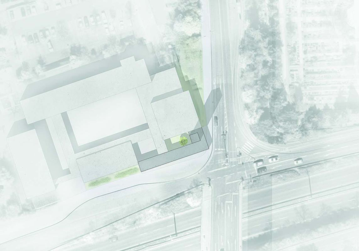 Der Entwurf sieht eine leichte aber wesentliche Neuplatzierung des Kirchturms in Richtung Doktor-Martin-Luther-King-Weg vor. Durch diese Verschiebung wird Platz für eine neue Pergola gewonnen, welche die Eingangssituation für das bestehende Ensemble der KHG aus Kirche, Pfar- reiräumen, Studentenwohnheim und Kindergrippe aufwertet und zum Doktor-Martin-Luther-King- Weg erweitert. Die überdeckte Eingangssituation bildet eine neue Außenkante des Gebäudekom- plexes und lädt gleichzeitig zum Verweilen ein. Durch Kirchturm, Pergola und Bestandsgebäude wird vor der Sakristei ein intimer Innenhof als Ort der Ruhe und Einkehr gebildet. Diese dezente Umstrukturierung verleiht der gesamten Hochschulgemeinde St. Albertus eine neue klare Form- sprache.